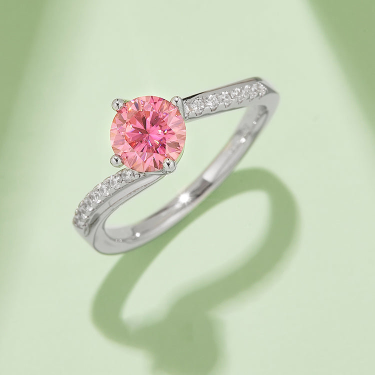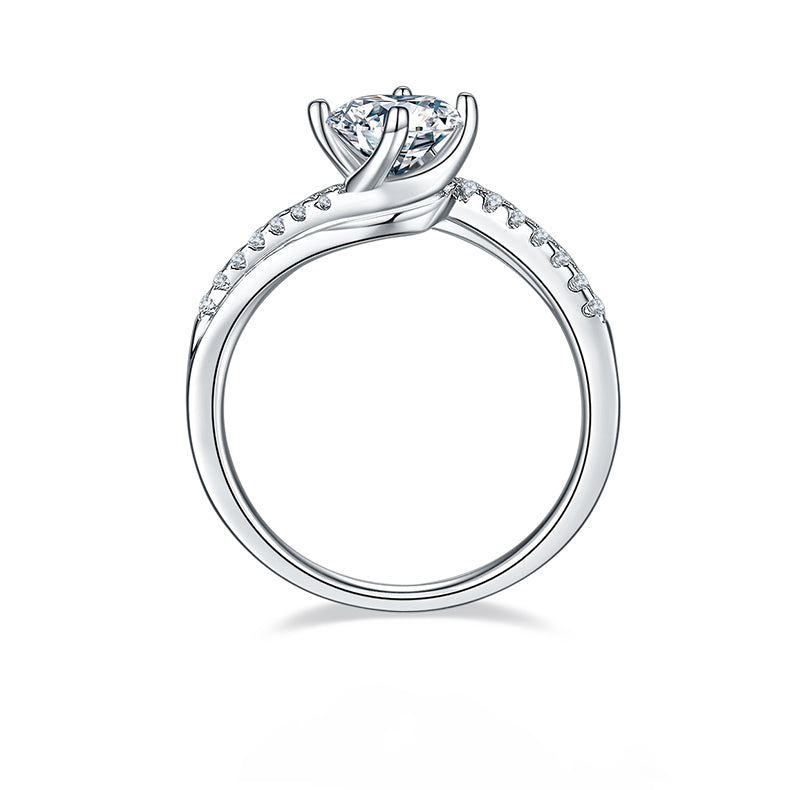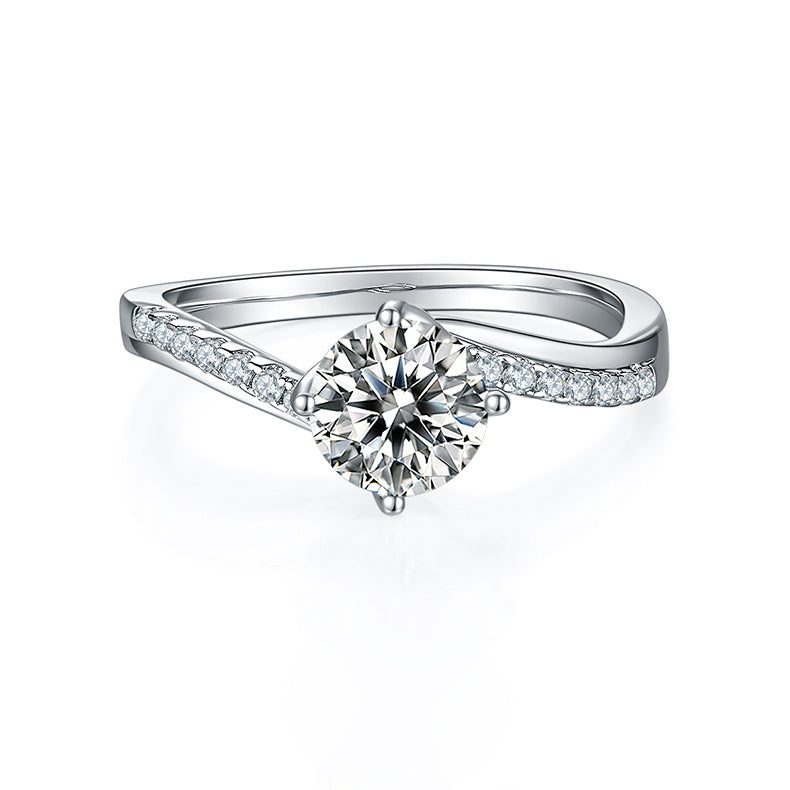 This ring features a 1.0-carat round cut Moissanite stone. The four-prongs design make the stone more prominent. Multiple small Moissanite stones are inlaid on the unique twist ring arm, making the entire ring more fashion and sparkly.
