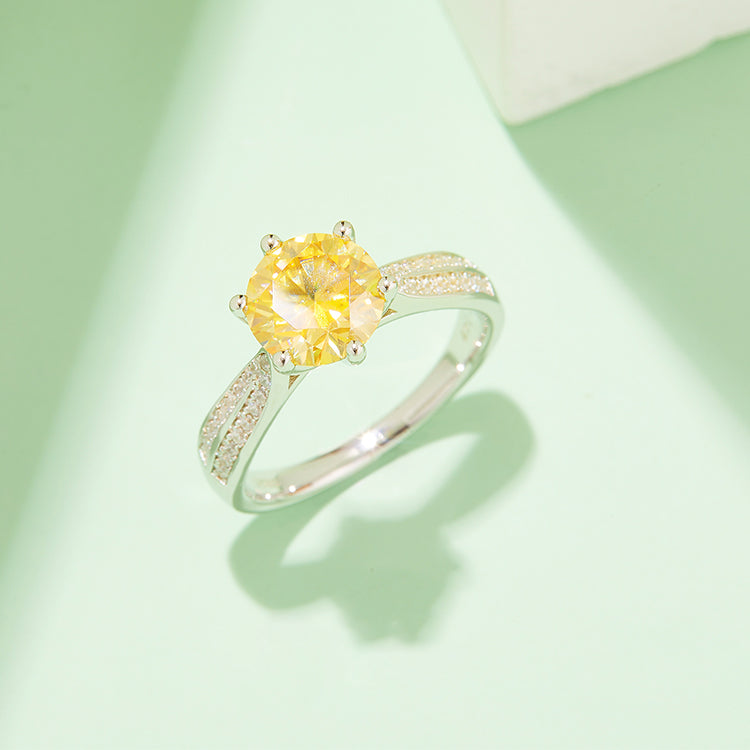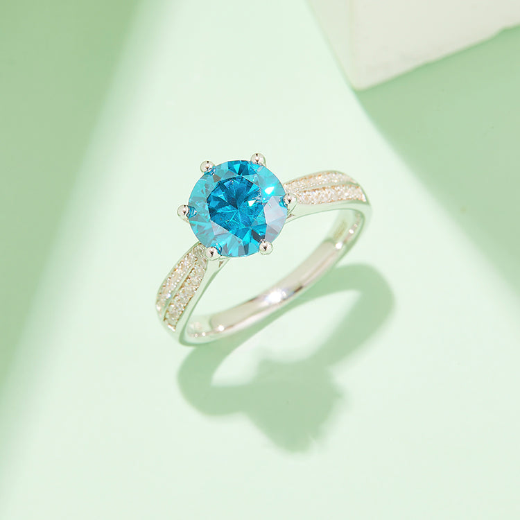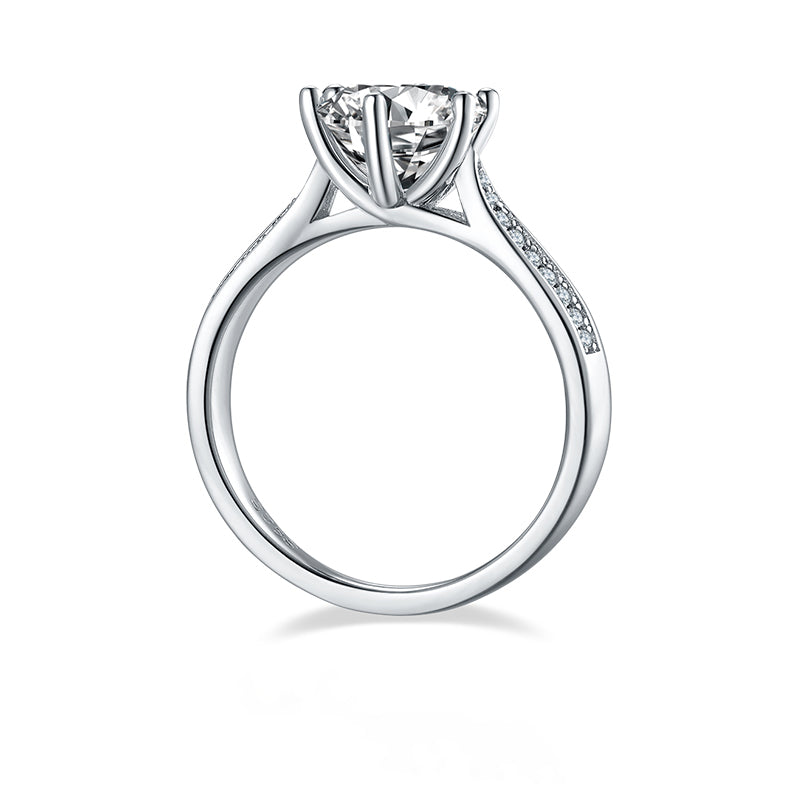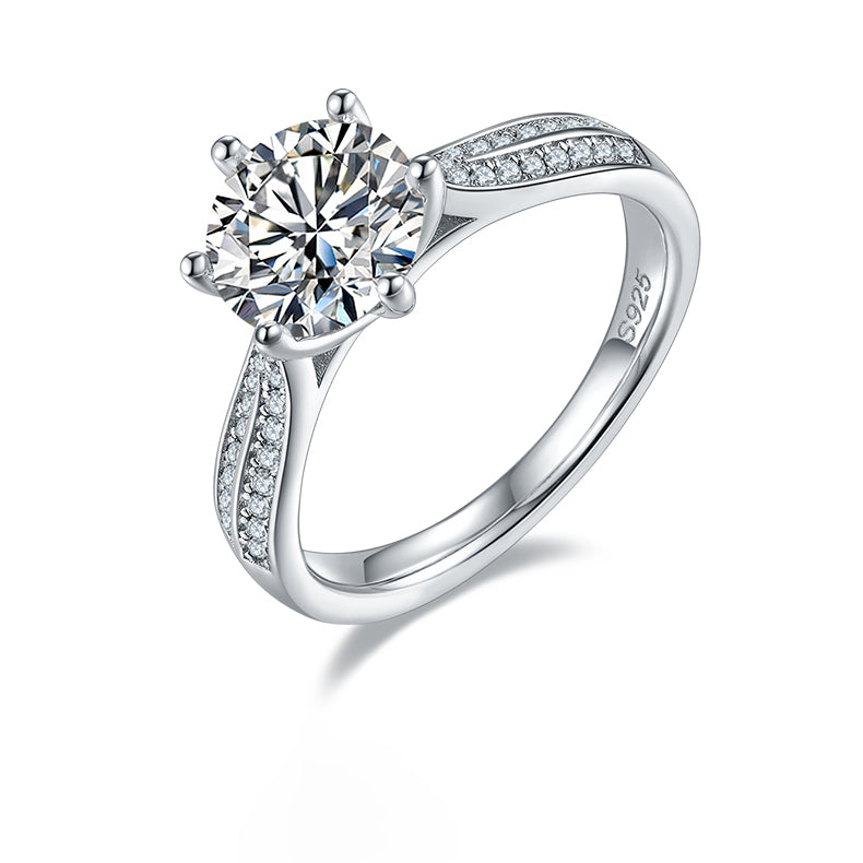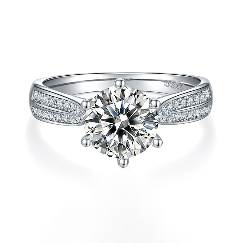 This luxurious and eye-catching ring is designed for women who desire a bold and sophisticated piece of jewelry. It features a 2.0-carat Moissanite stone, and the cutting and polishing technology of the stone makes it emit dazzling light. Multiple small Moissanite stones are inlaid on the ring, making the entire ring more luxurious and sparkly.