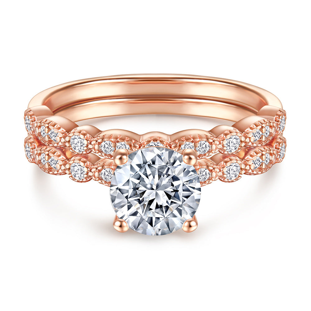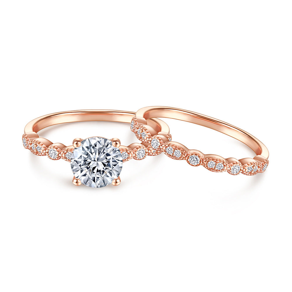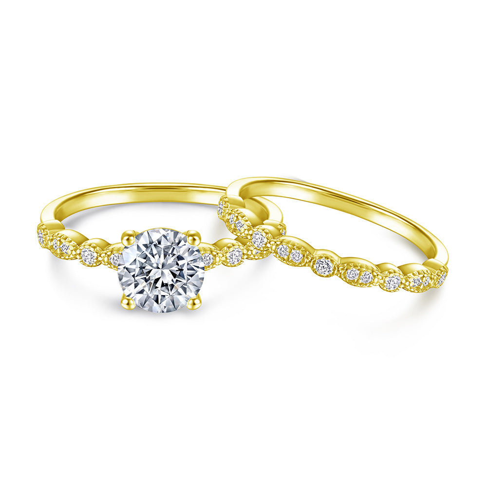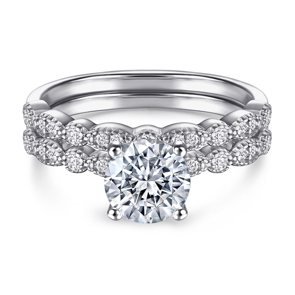 Four Prongs Round Zircon with Beading Silver Ring Set for Women