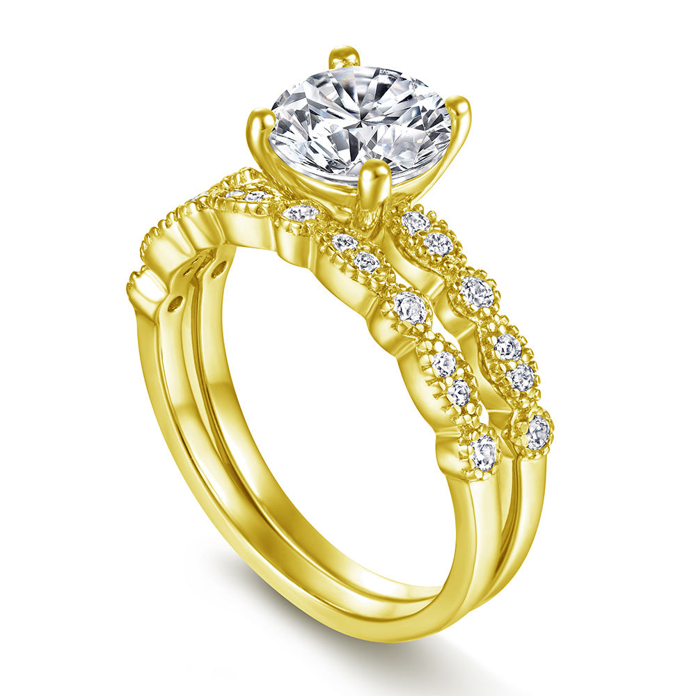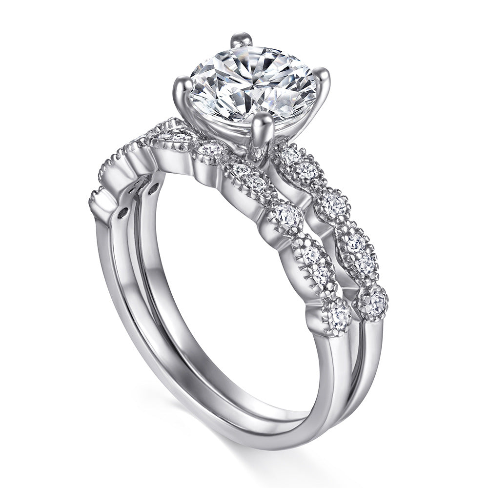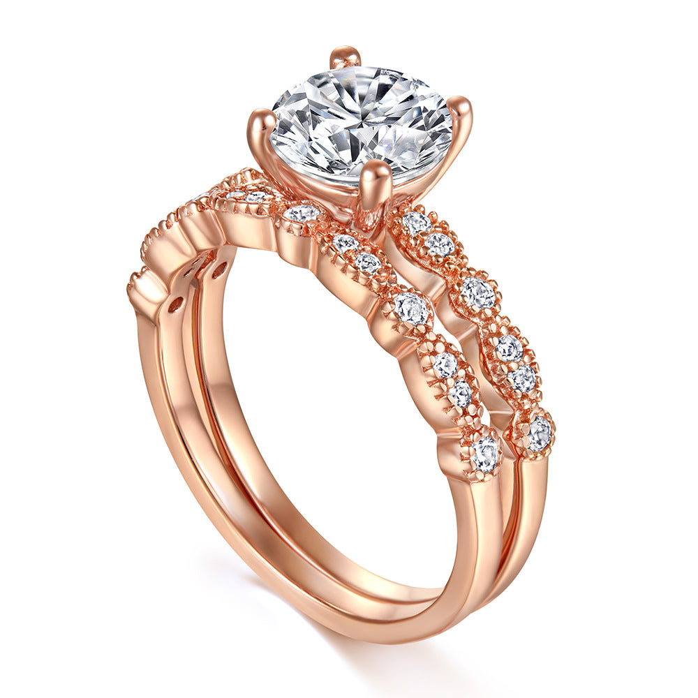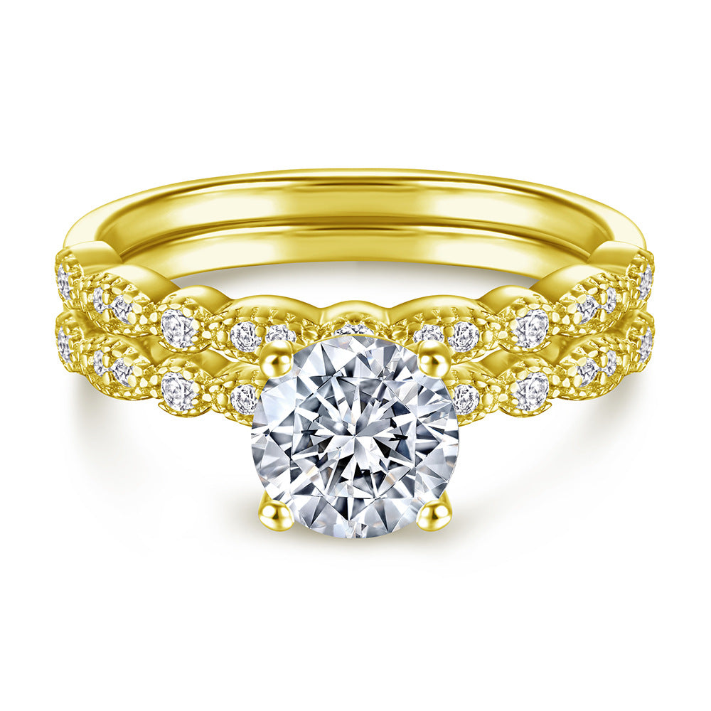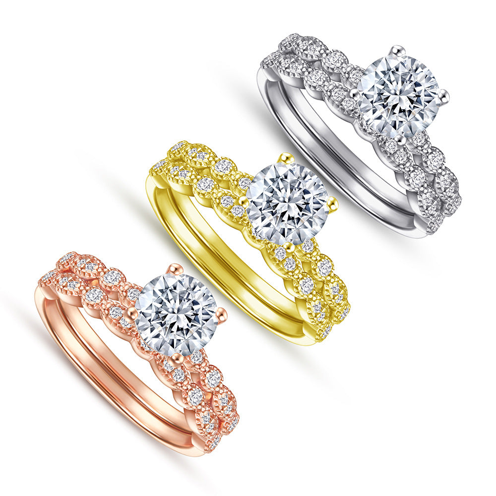 Four Prongs Round Zircon with Beading Silver Ring Set for Women