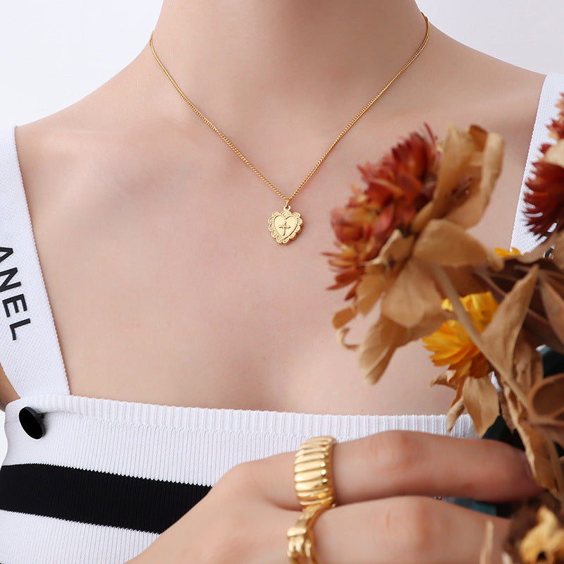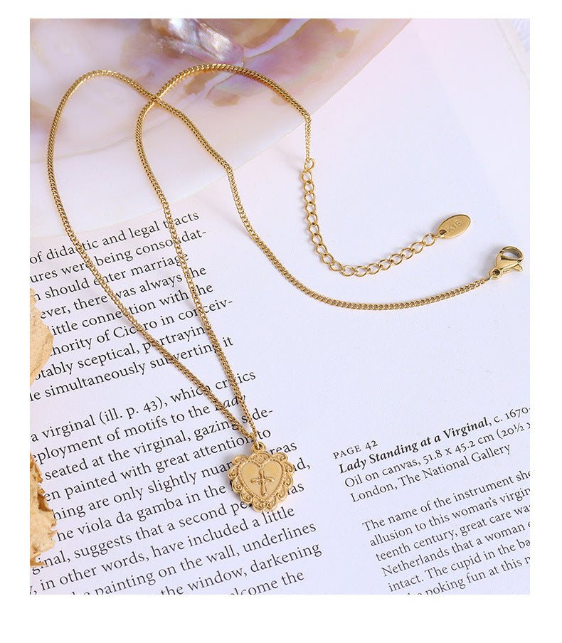 Elegant Heart Relief Cross Pattern Love Necklace in Gold Plated Titanium Steel