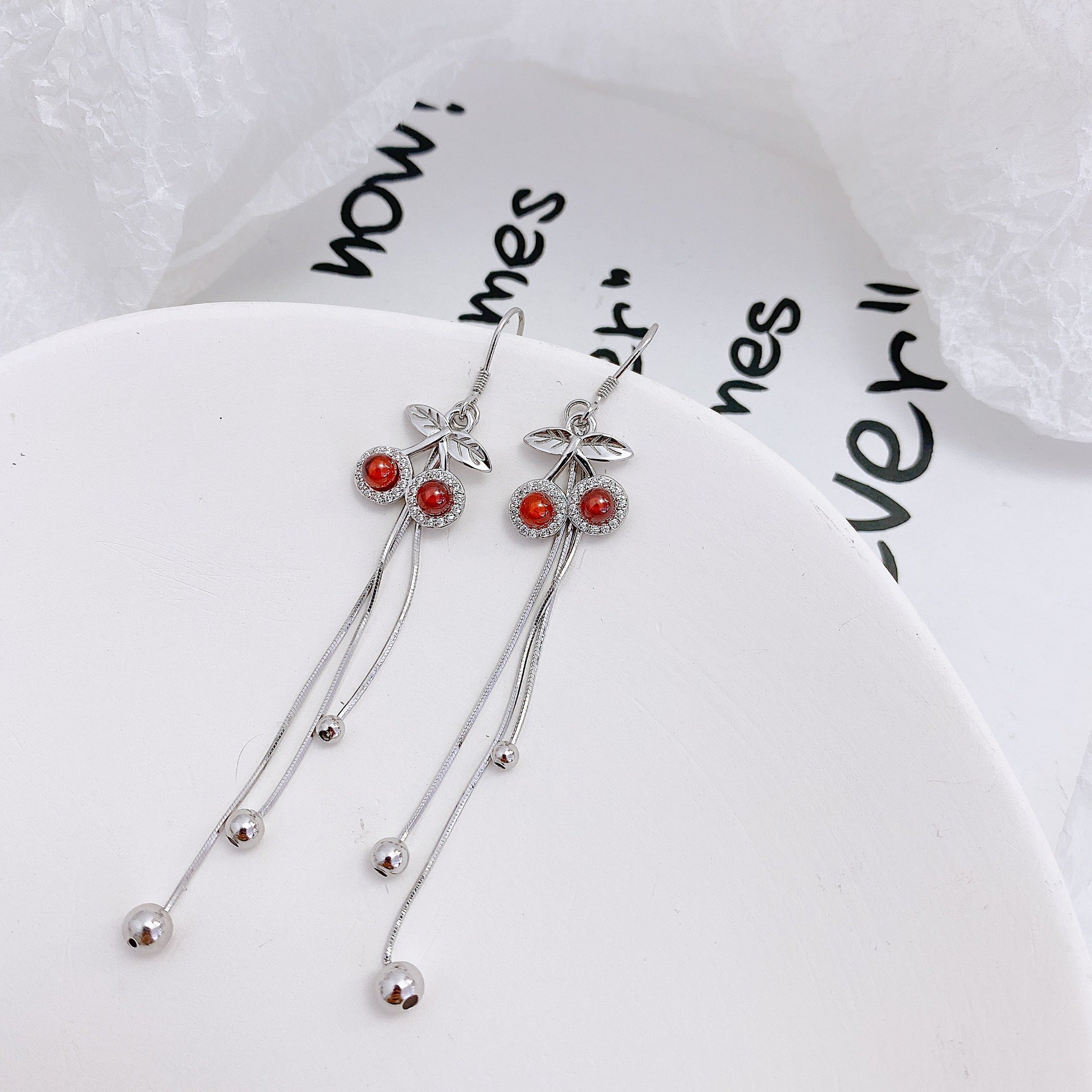 Garnet Cherry Tassel Silver Drop Earrings for Women