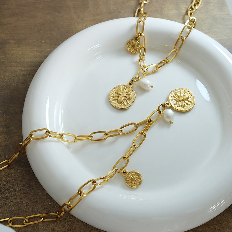 Bee Round Brand Titanium Steel Necklace with Freshwater Pearl