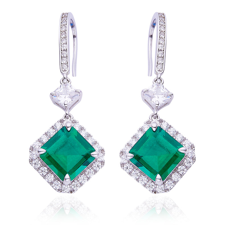 This hook earring is a sterling silver crafted masterpiece. Its 4-carat green square zircon creates a luxurious and timeless single solitaire pendant. The halo effect, formed by surrounding white small zircons, reflects stunning light when exposed to illumination. Suitable for everyday wear or elegant events, this earring is a symbol of sophistication and a meaningful gift for loved ones.
