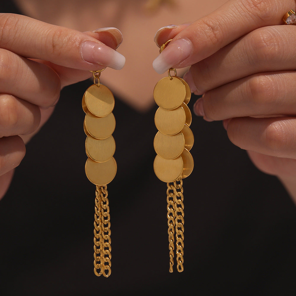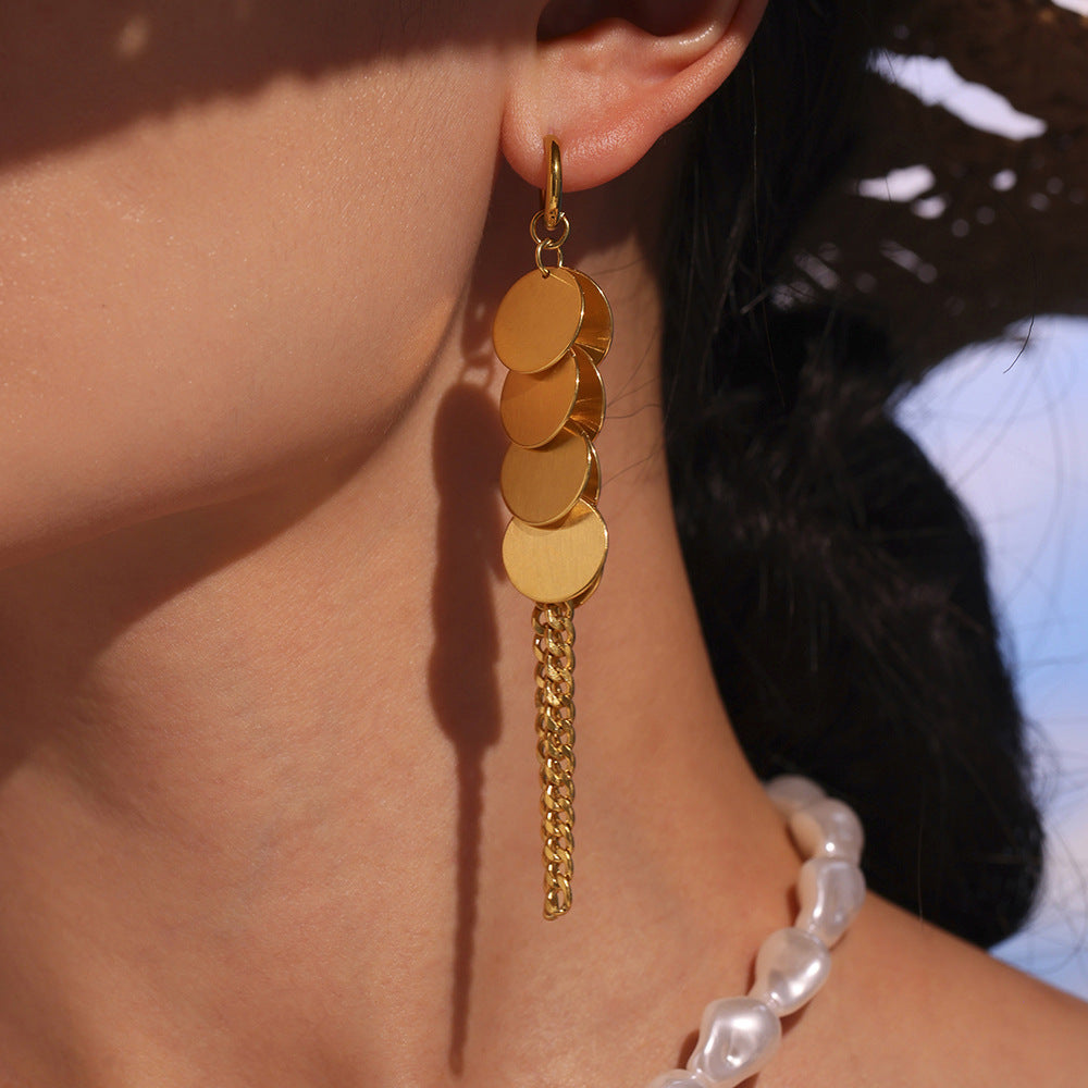 Planderful unveils high polishing and super texture disc chain fringed earrings crafted in stainless steel plated with 18K gold. These temperament earrings blend a sleek disc-chain silhouette with tactile fringe details, delivering a refined shine that elevates any look—from everyday ensembles to evening wear.