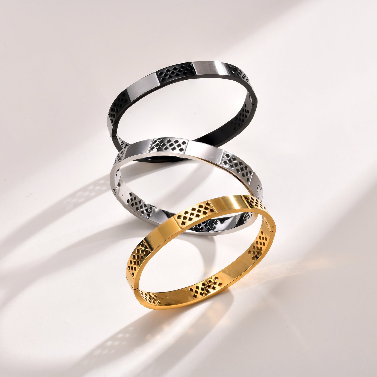 Discover the essence of style and individuality with the Hip Hop Men's Stainless Steel Hollow Glossy Rhombus Lattice Openable Bracelet Gold Black Steel for men. This exquisite bracelet combines contemporary design with the durability of titanium steel, making it the perfect accessory for modern men who appreciate both fashion and functionality. Its unique hollow rhombus lattice design not only adds a striking visual appeal but also ensures a lightweight yet robust wear.