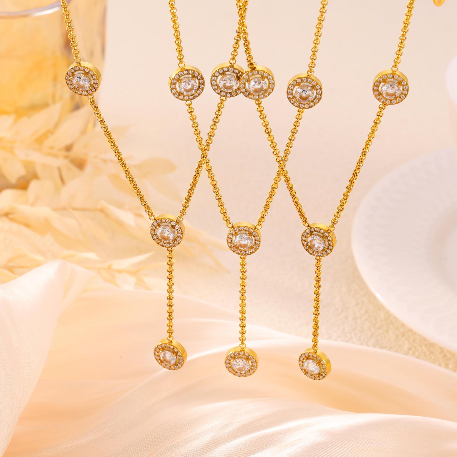 Introducing our fashionable, minimalist, trendy, versatile, and elegant jewelry featuring hollowed out round plaques and zircon inlaid design. This titanium steel necklace exudes a sense of pendant design, making it a must-have accessory for your collection.