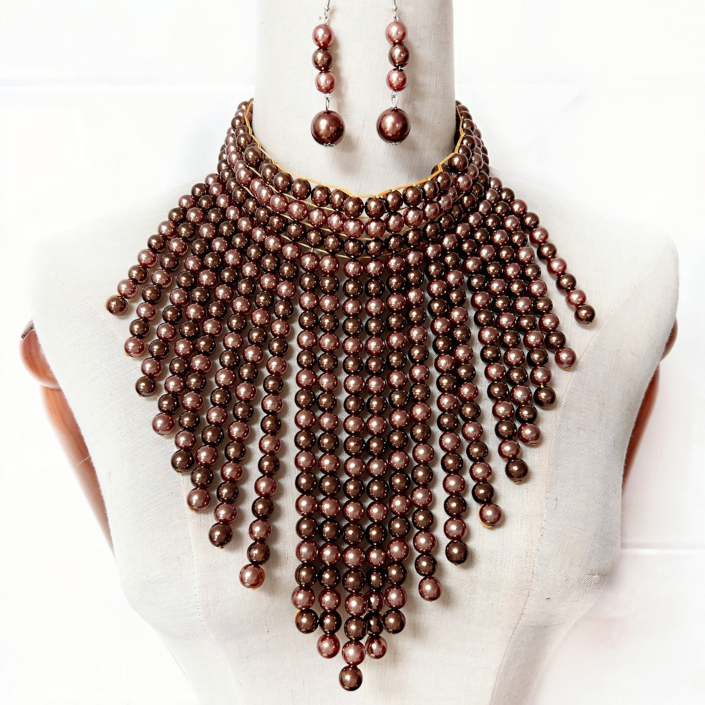 Exaggerated Triangular Scarf Necklace with Multi-layer Tassels and Imitation Pearl Accents