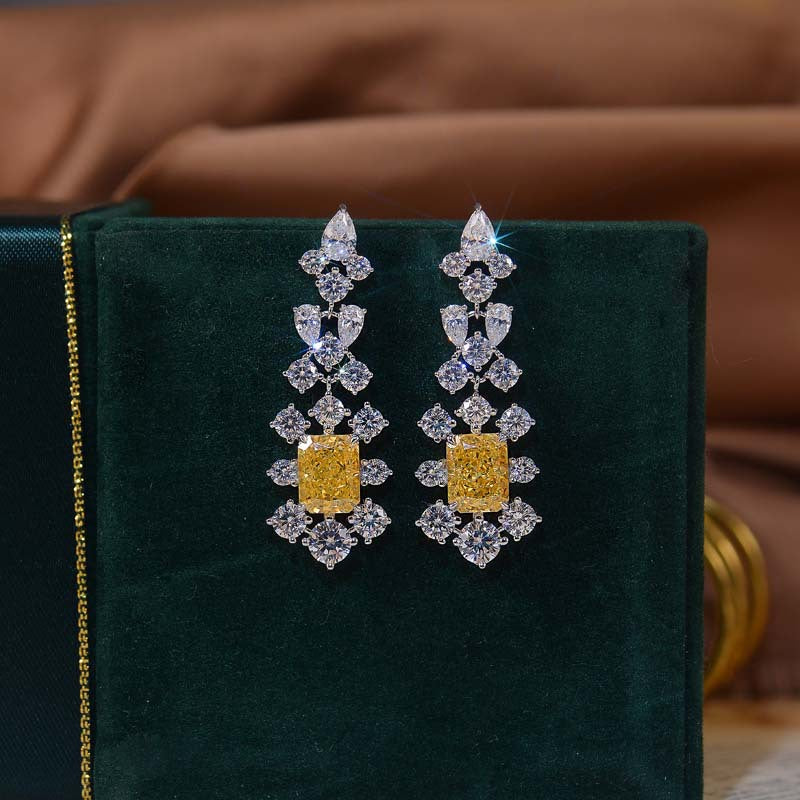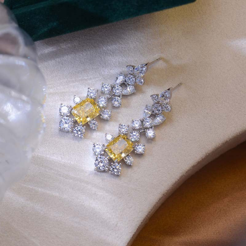 These striking drop earrings feature a 7*9mm rectangular yellow zircon with a unique flower tassel design. The perfect addition to your look, these earrings will add a stylish touch to any outfit.
