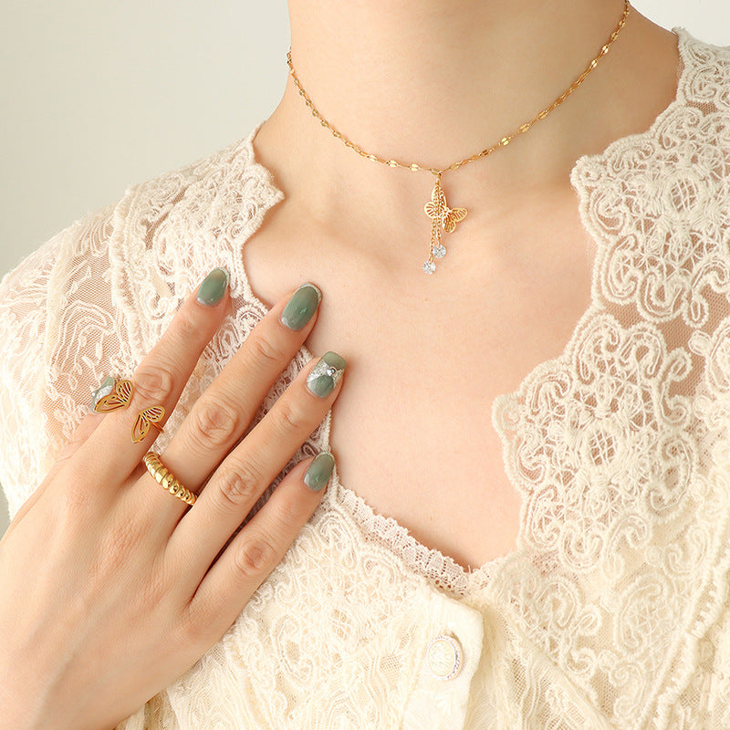 Butterfly Tassel Zircon Pendant Necklace with Artistic Pastoral Design