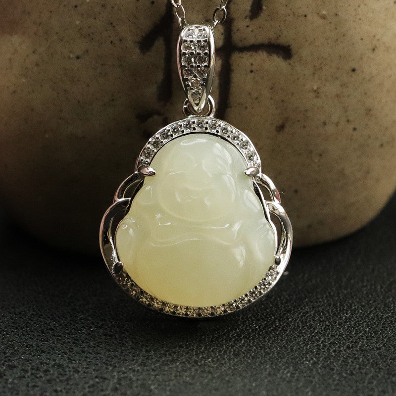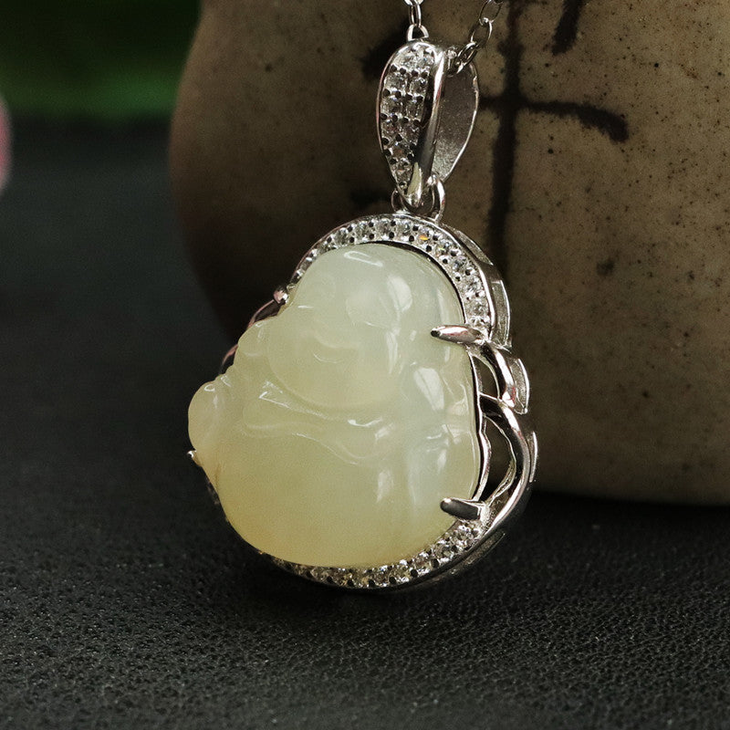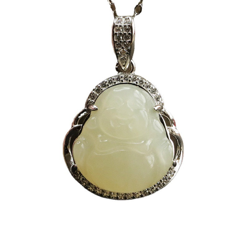 S925 Silver Natural Hetian Jade Pendant Buddha Zircon Necklace Jewelry