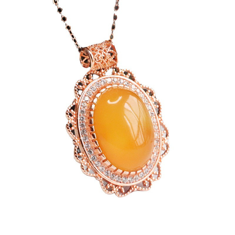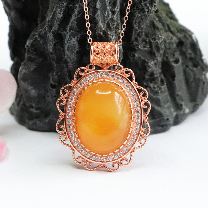 Discover the allure of our S925 Silver Natural Oval Brown Red Honey Wax Amber Pendant Zircon Halo Hollow Rose Gold Necklace from the Planderful Collection, aptly named Fortune's Favor.