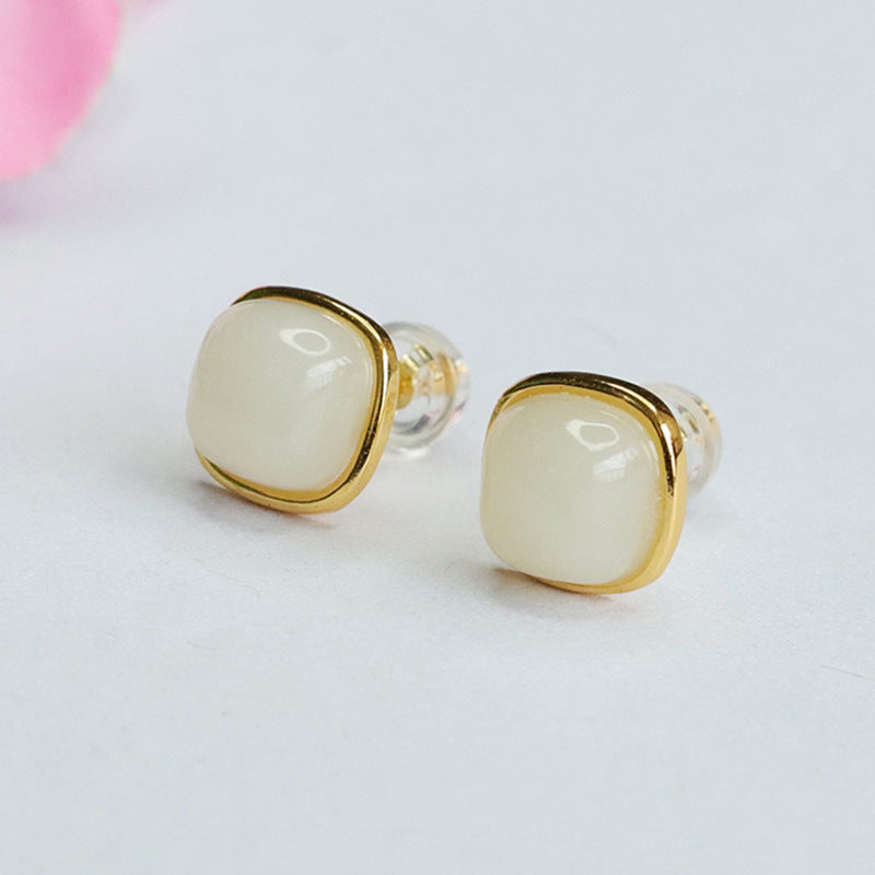 White Jade and Sterling Silver Earrings with Inlaid Natural Hotan Jade