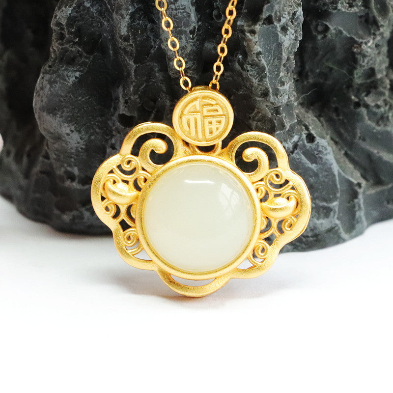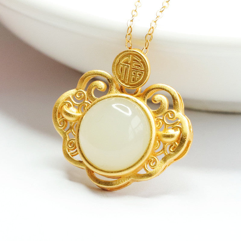 S925 Silver Natural Hotan Jade Pendant Round White Jade Hollow Blessing Ruyi Necklace