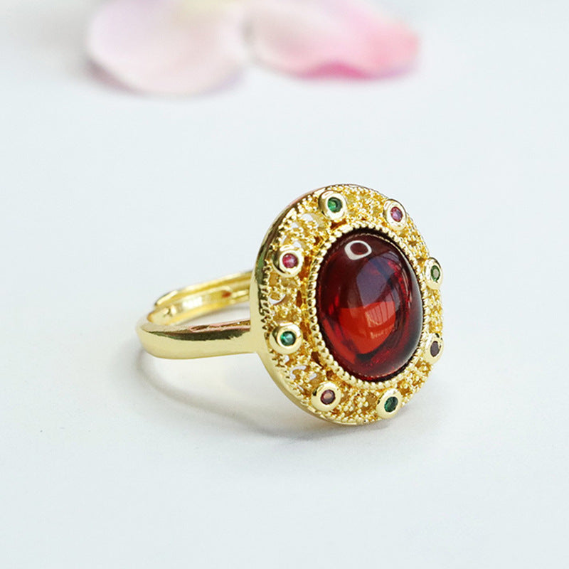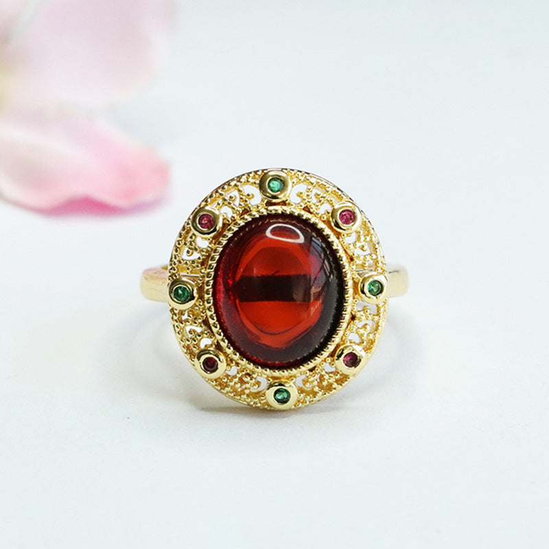 Elevate your look with the unique charm of blood amber and zircon, set in a vintage-inspired design. This ring is a true statement piece that embodies tradition and artistry.