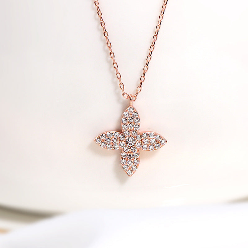 The clover is meticulously adorned with micro-inlaid zirconium stones, adding sparkle and sophistication.