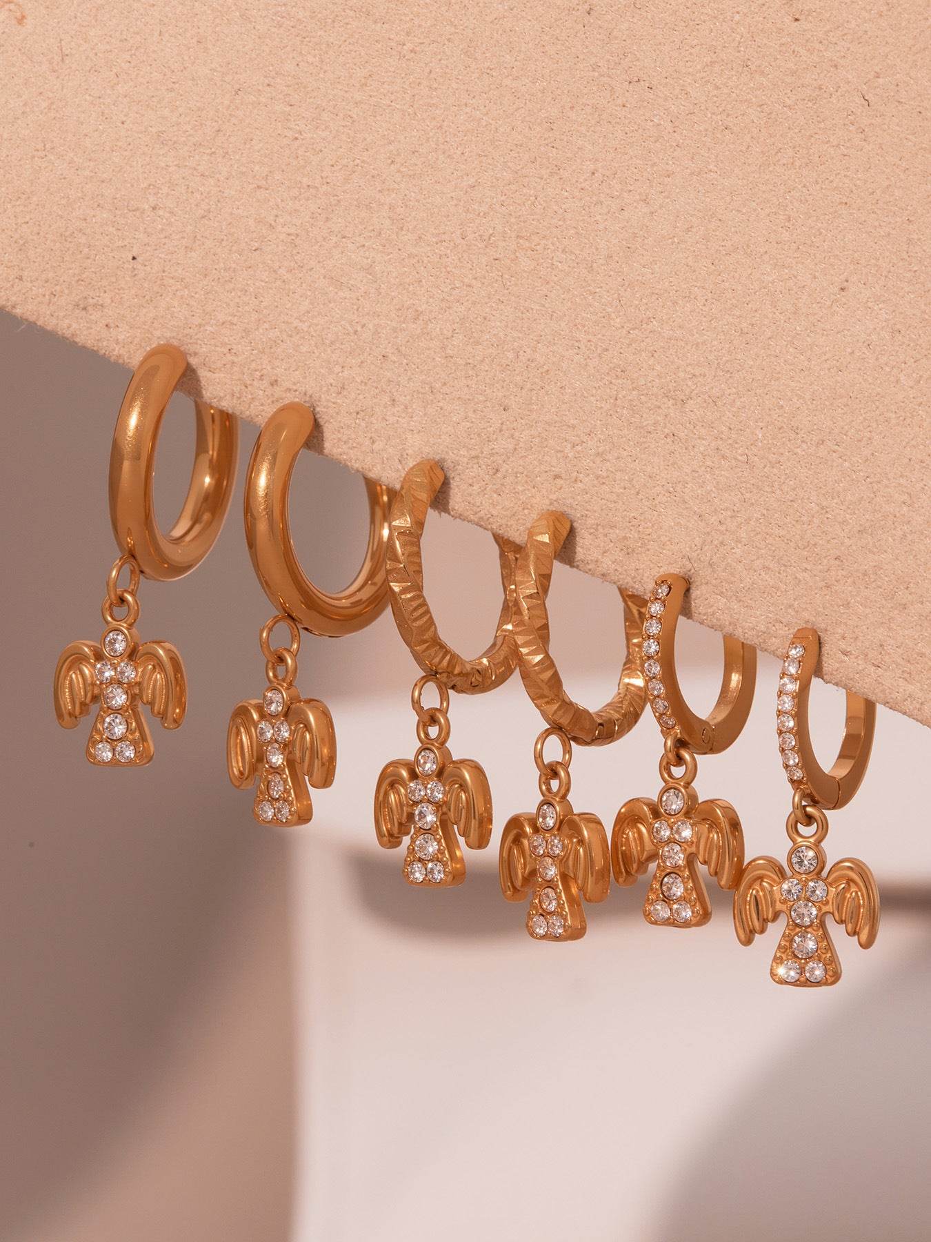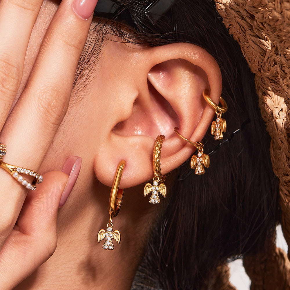 Elevate your everyday style with the Planderful Light Luxury Super Flash 5A Zircon Angel Pendant Ear Buckle Earrings. This eye-catching pair blends sparkling 5A zircon, a chic angel pendant, and a secure ear buckle design, finished in environmentally friendly titanium steel for a durable, skin-friendly shine.