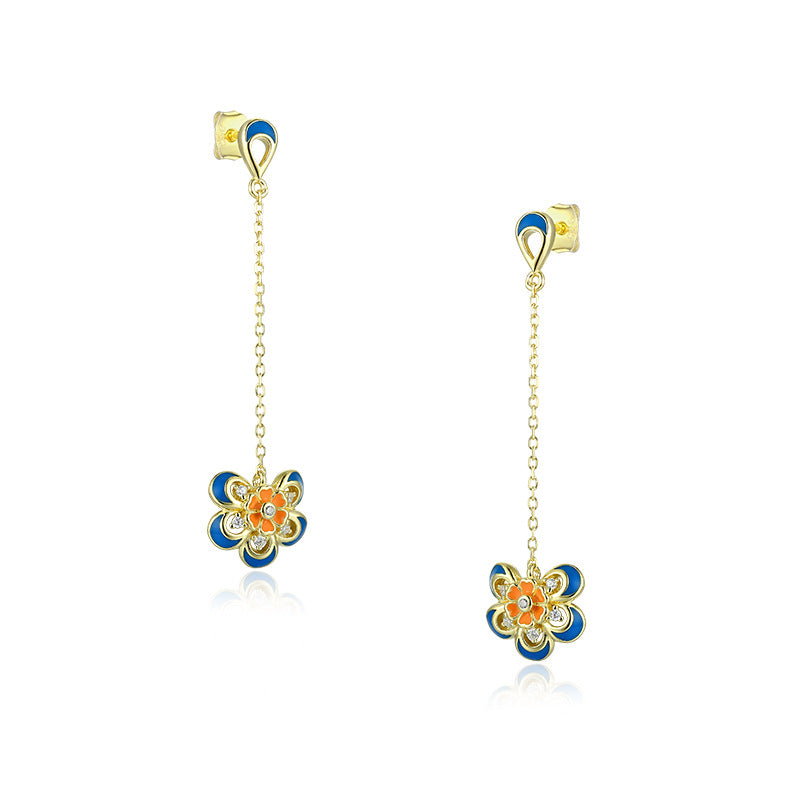 Tassel Enamel Flower with Zircon Silver Drop Earrings