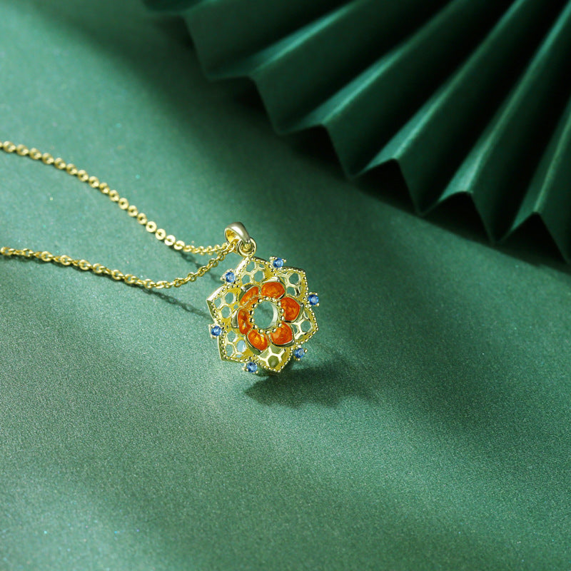 Lotus Pattern Series Blue Zircon Enamel Hollow Flower Pendant Silver Necklace for Women