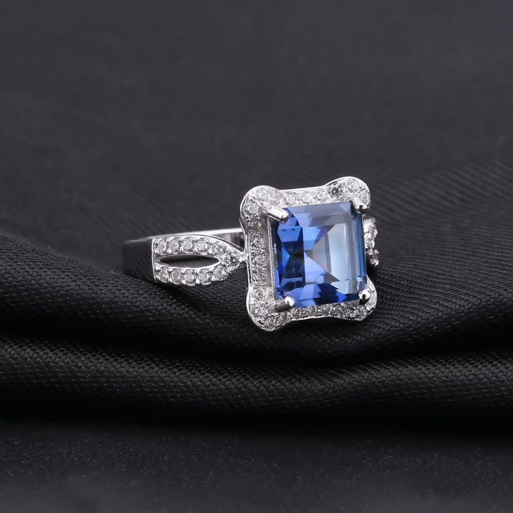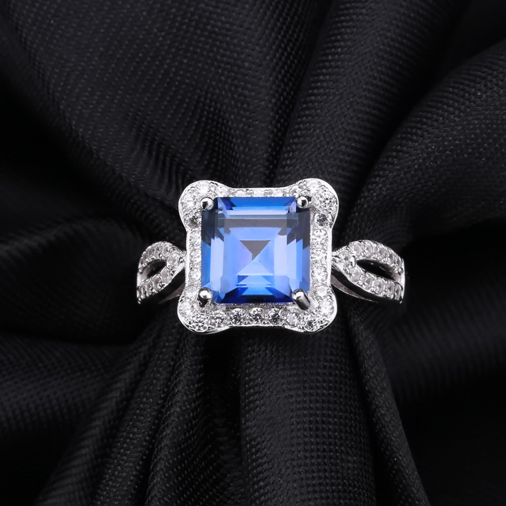 Transform any look with this elegant Square Soleste Halo Modern Split Shank Silver Ring. Crafted from sterling silver, this beautiful piece features a square blue crystal at its center, surrounded by a lush Soleste Halo, and a split shank ring arm uniquely decorated with small zircons for extra sparkle. Whether it's a special occasion or everyday glam, this stunning piece is the perfect choice.