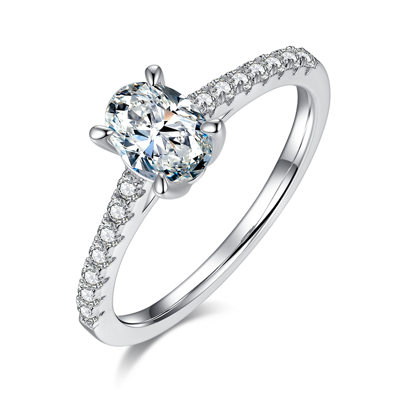 This exquisite ring features a tranditional oval shape Moissanite and is set with Moissanite on the ring band to make the entire ring more shinny. In addition, the four-prongs design makes the Moissanite stone more prominent. This ring has long-lasting luster and is not easy to oxidize or wear-resistant. It’s also not easy to cause allergies.This ring is the preferred gift for birthdays, anniversaries or Valentine’s Day.