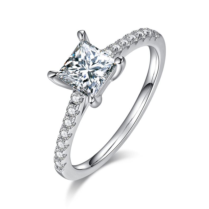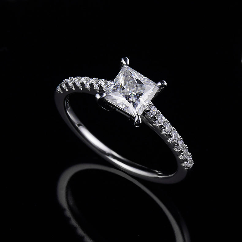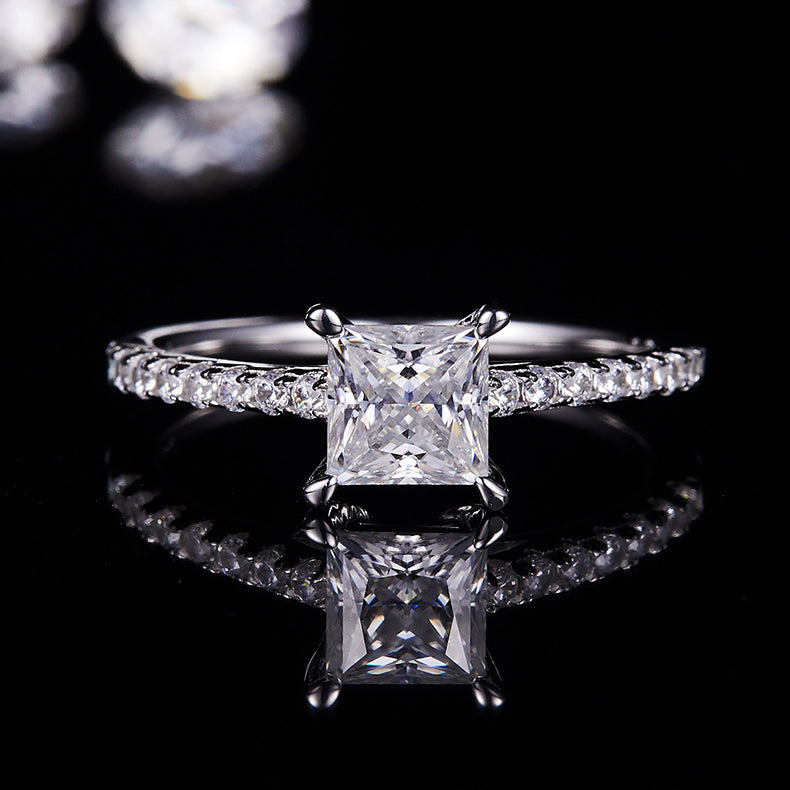 This exquisite ring features a fashion princess cut Moissanite and is set with Moissanite on the ring band to make the entire ring more sparkly. In addition, the four-prongs design makes the Moissanite stone more prominent. This ring has long-lasting luster and is not easy to oxidize or wear-resistant. It’s also not easy to cause allergies.This ring is the preferred gift for birthdays, anniversaries or Valentine’s Day.