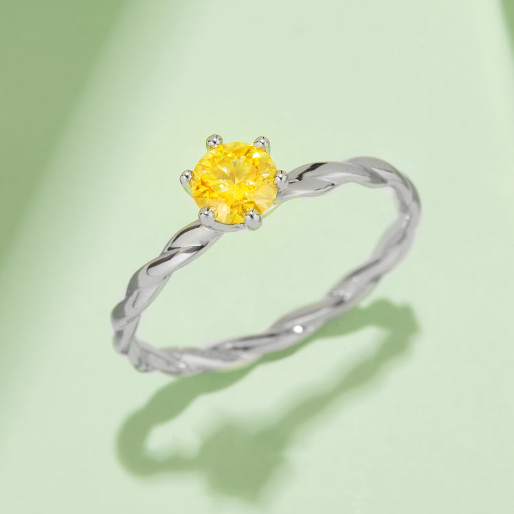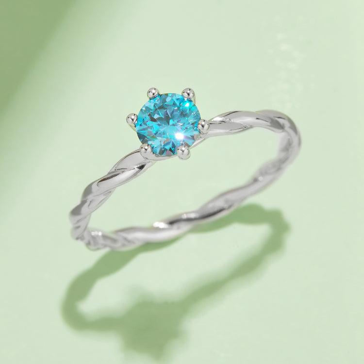 This Round Cut Moissanite ring features a 0.5ct Moissanite stone, securely set with six prongs and unique twist line ring arm detailing. The combination of classic cuts and subtle detailing creates an elegant and sophisticated aesthetic.