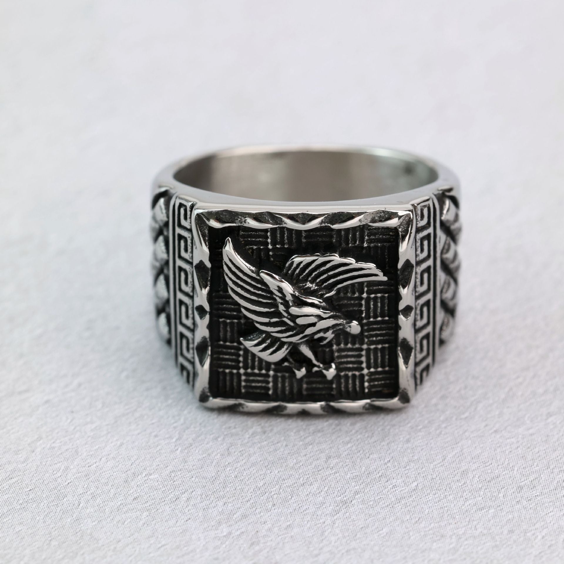 Stainless Steel Eagle Ring Great Wall Pattern Unisex Retro Square Timeless Bold Jewelry By Planderful