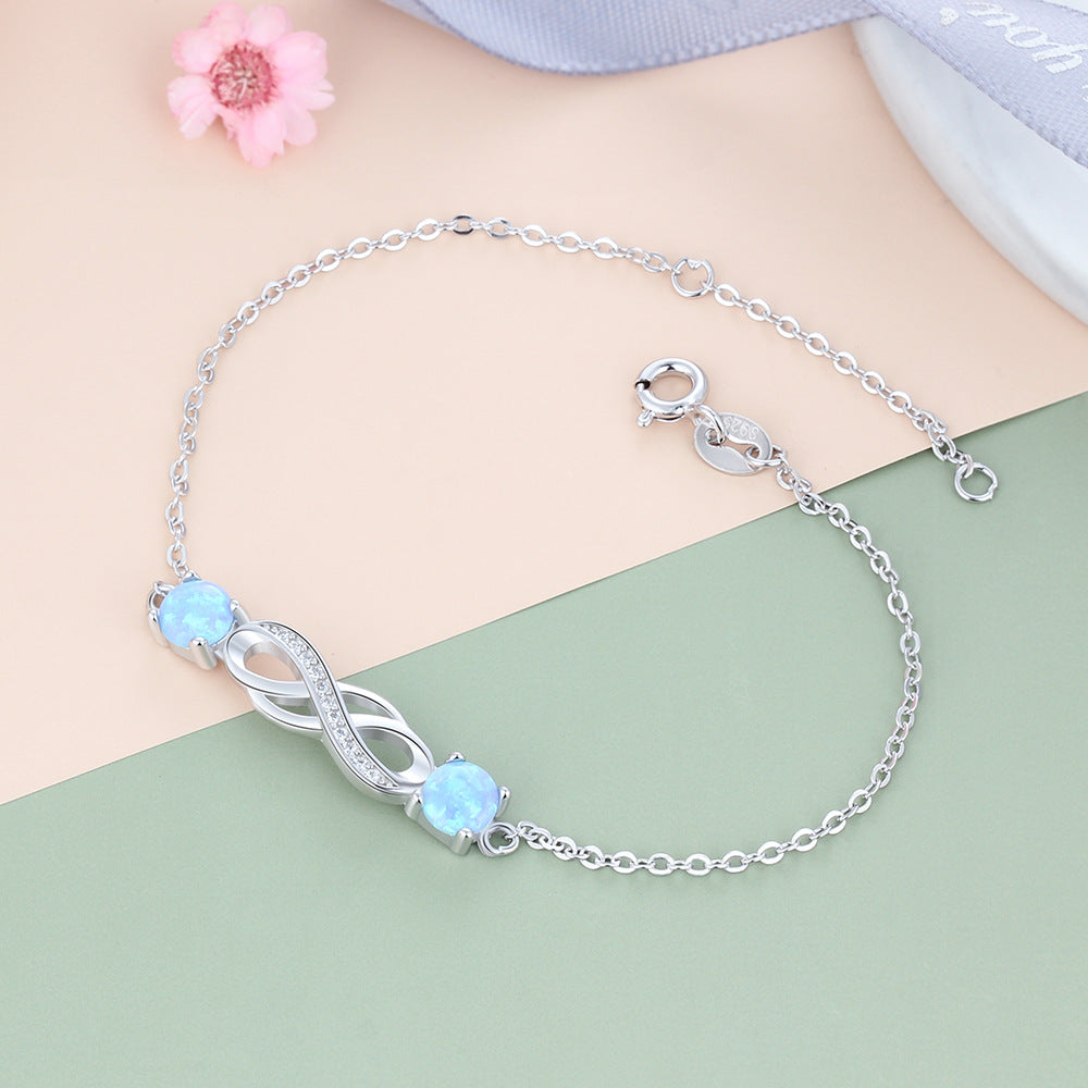 This exquisite bracelet features an intertwine zircon infinite symbol with two blue round opal gems, all set in a luxurious bracelet. Its simple yet striking design will elevate any ensemble with a touch of regal elegance. Crafted with sterling silver and adorned with blue opal gems, this bracelet is a stunning example of quality jewelry. Make a lasting impression with its timeless design.