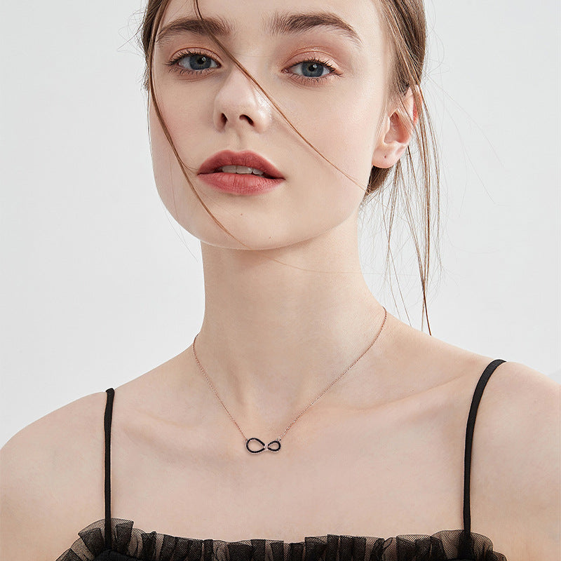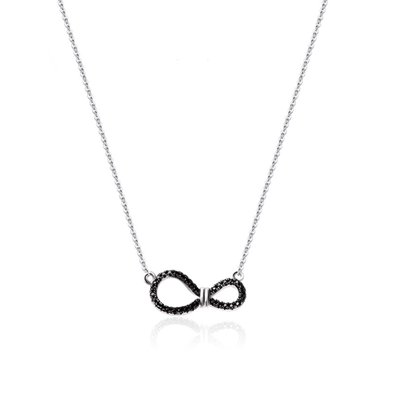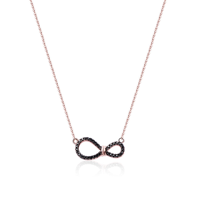 This necklace features a simple bowknot pendant like a infinite symbol that symbolizes infinite love. The pendant is embellished with micro-set zircon stones that add a sparkling and glamorous touch. The pendant has a hollow design that creates a light and airy effect. This necklace is a romantic and fashionable accessory that can express your love and style. You can wear it alone or layer it with other necklaces for a stacked and trendy look. This necklace is also a perfect gift for yourself or someone you love, as it can represent your bond and commitment.