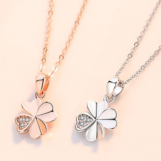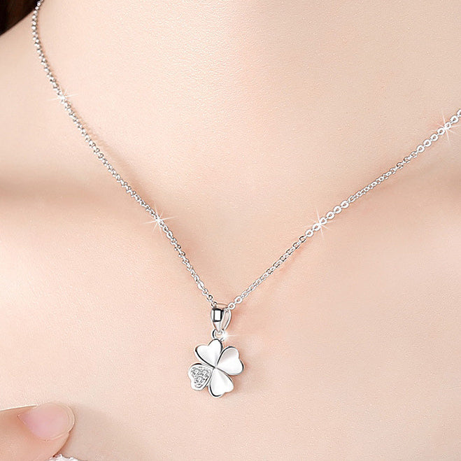 Valentine's Day Gift Heart-shape Leaf Clover with Zircon Silver Necklace for Women