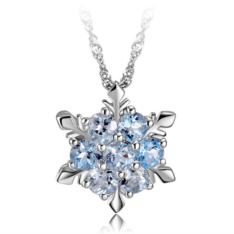 Celebrate the beauty of winter with this Luxury Sterling Silver blue zircon Snowflake Pendant This pendant features a delicate snowflake that is made of sterling silver and decorated with blue zircon stones.