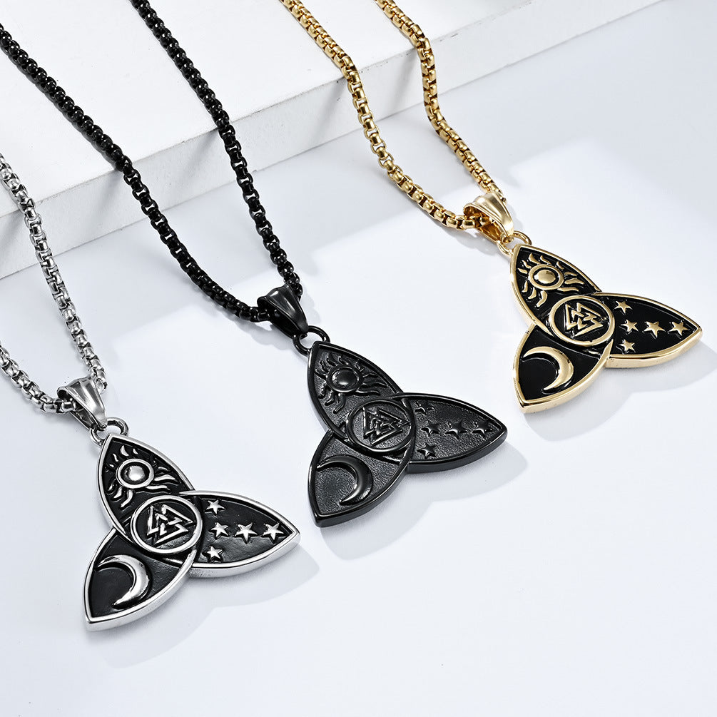Discover the allure of the Nordic Celtic triangular knot star moon sun titanium steel necklace mythical Odin triangular knot pendant for men. This uniquely designed pendant not only showcases exquisite craftsmanship but also embodies deep-rooted meanings associated with strength and spirituality. Crafted from high-quality titanium steel, this necklace promises durability while ensuring a stylish appearance that complements any outfit.