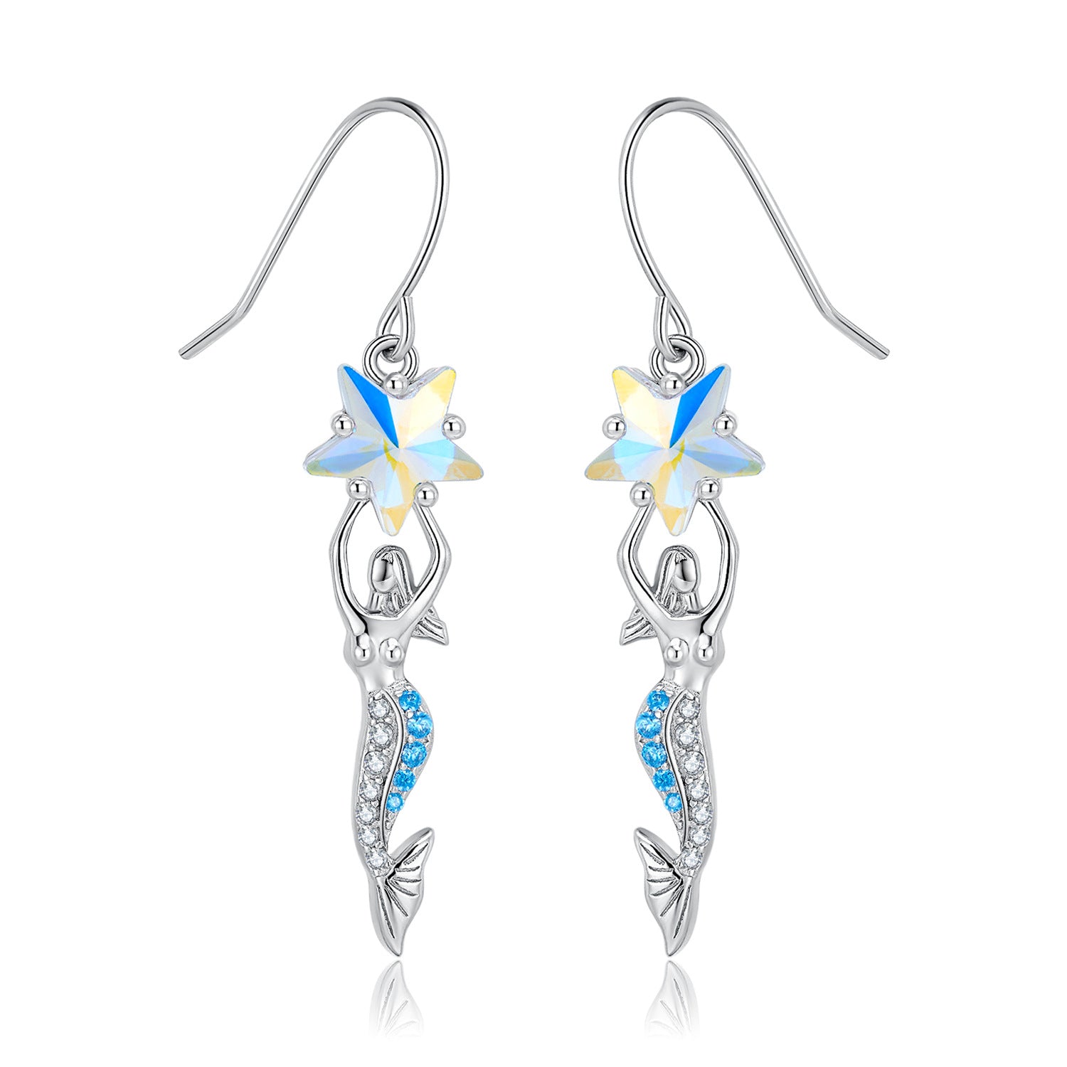 Pentagram Zircon Mermaid Pendant Silver Hook Earrings