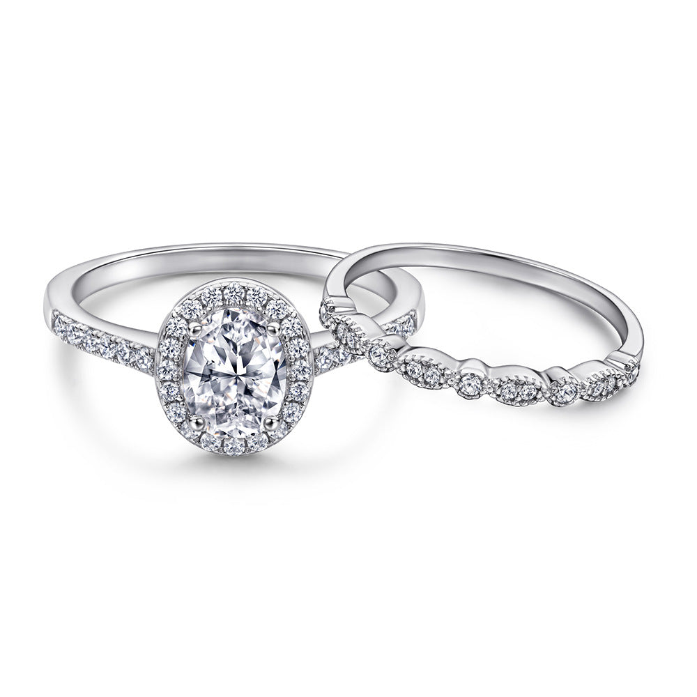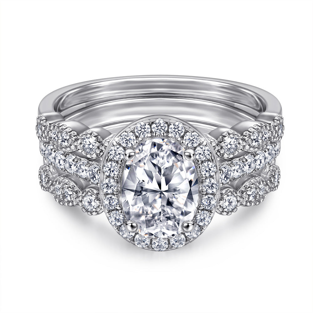 Oval Zircon Soleste Halo with Beading 3 Pieces Silver Ring Set