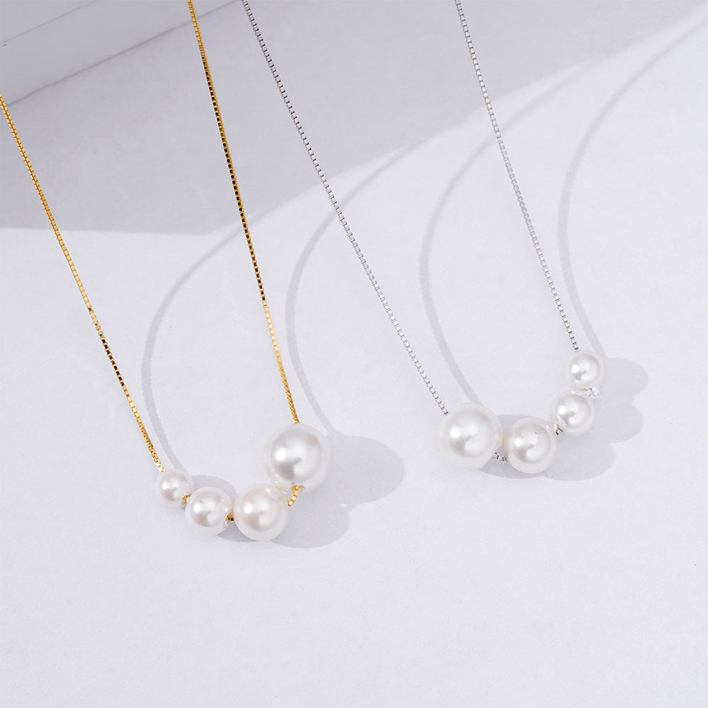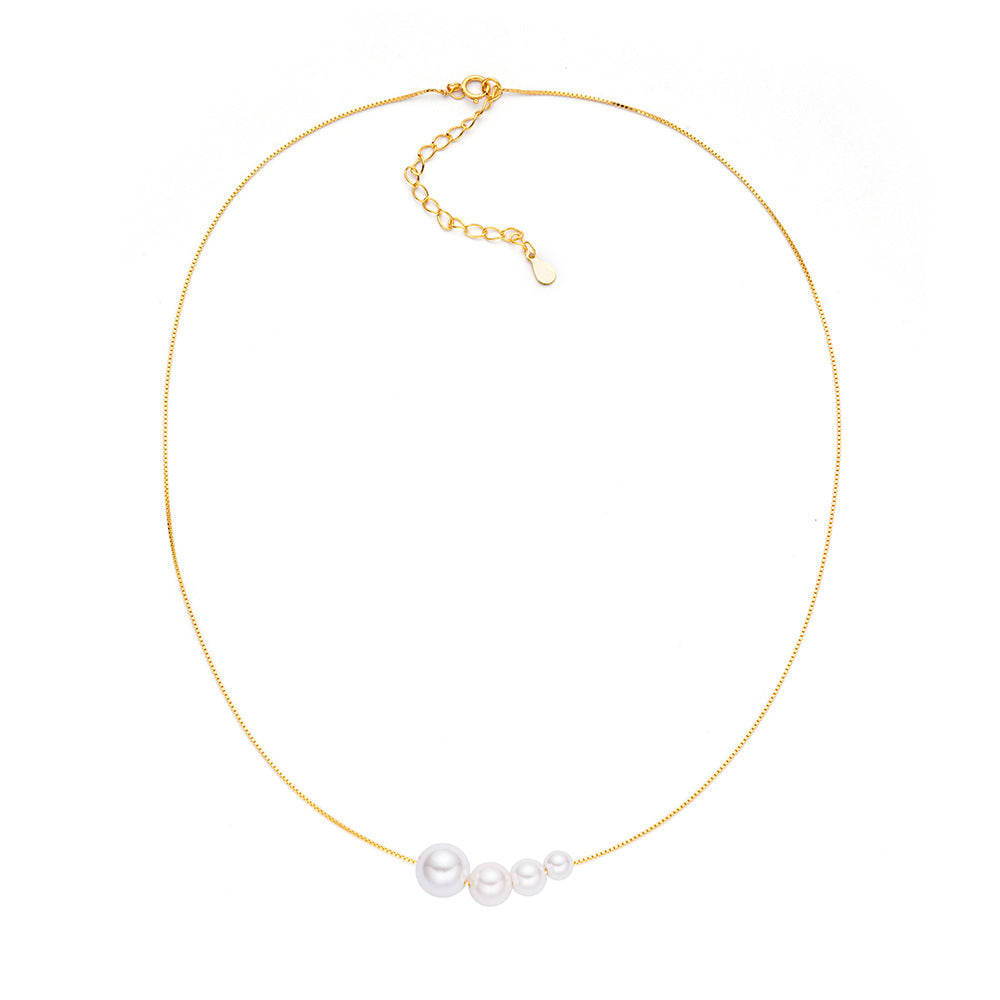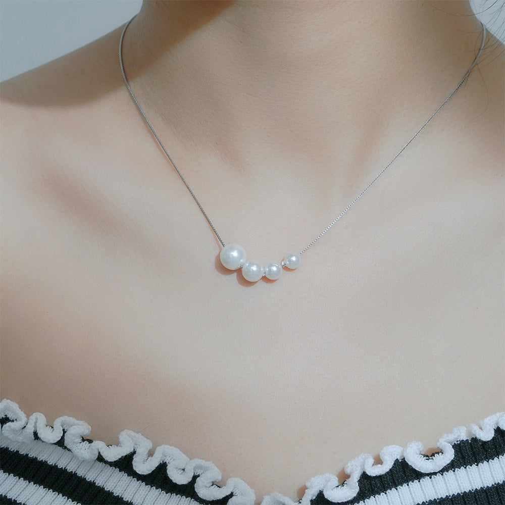 This Four Round Pearl Silver Necklace shines with delicate sophistication. Crafted with four pearls of different sizes, from big to small, the stunning pendant adds a touch of class and elegance to any outfit. The perfect accessory for any formal occasion.