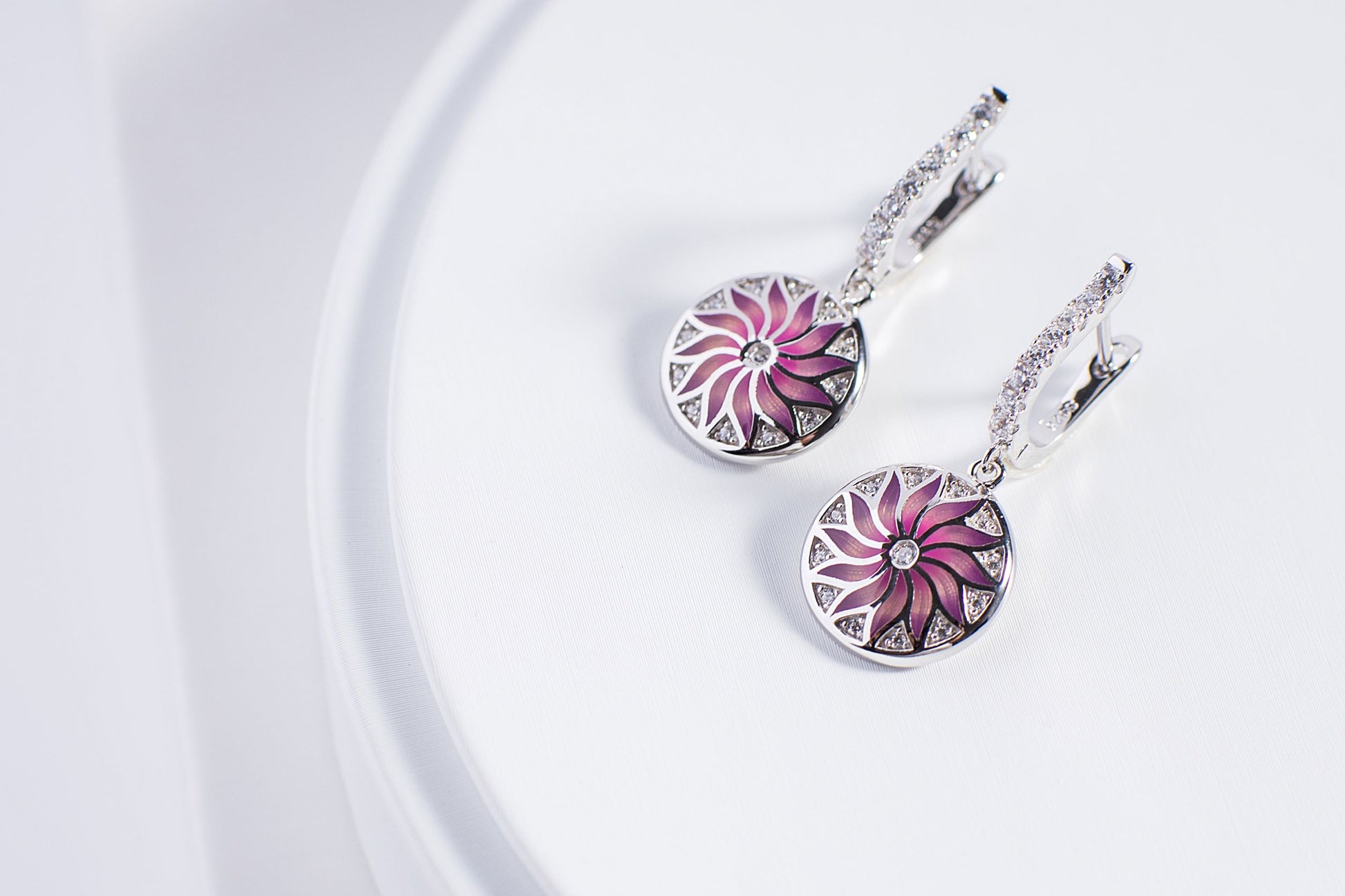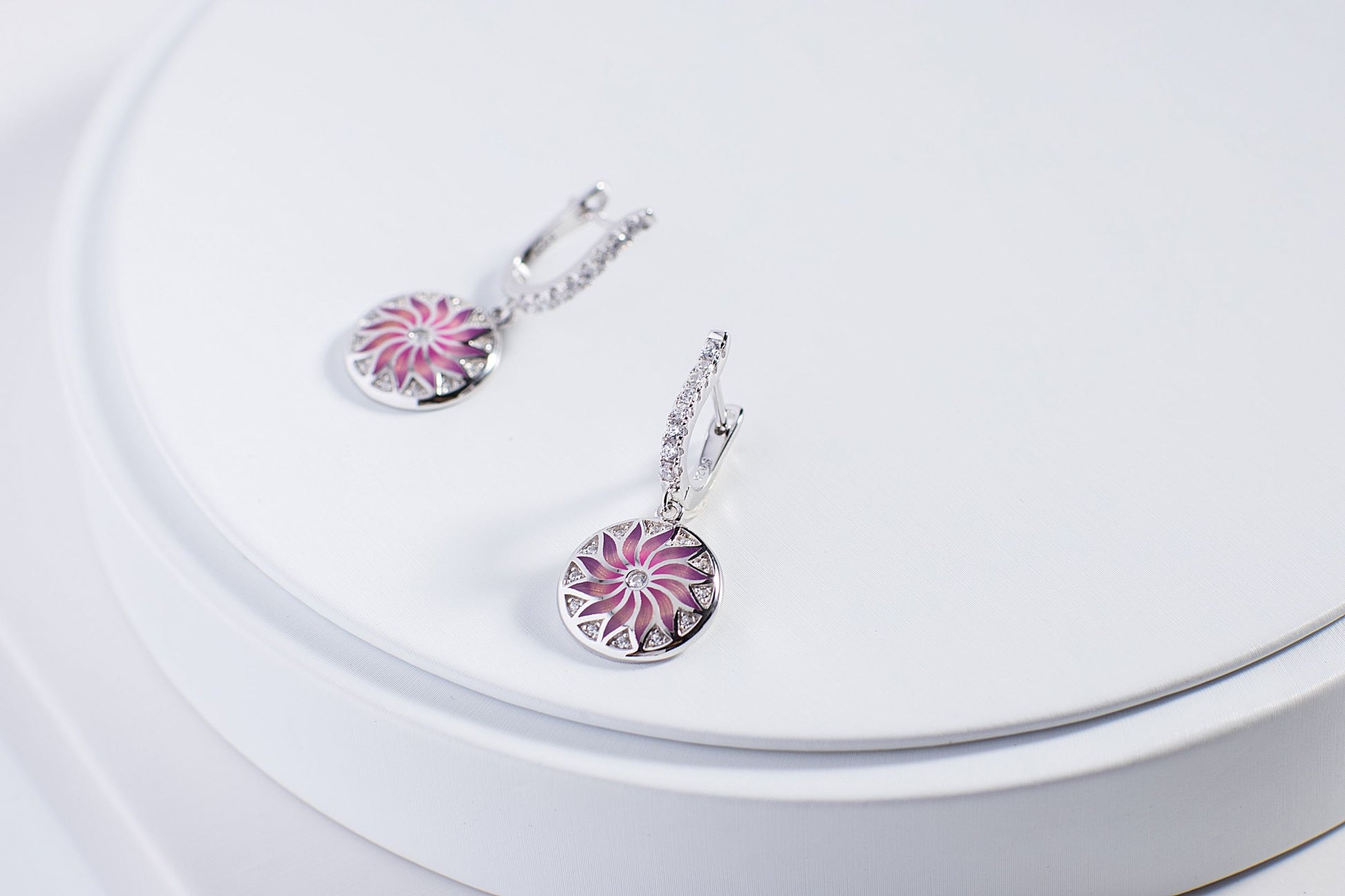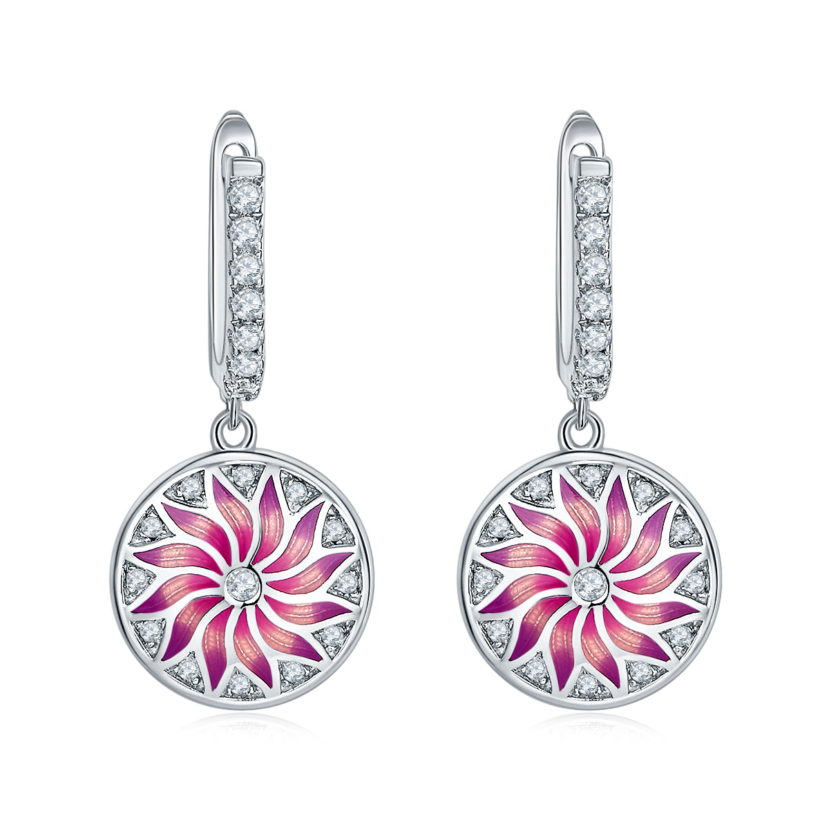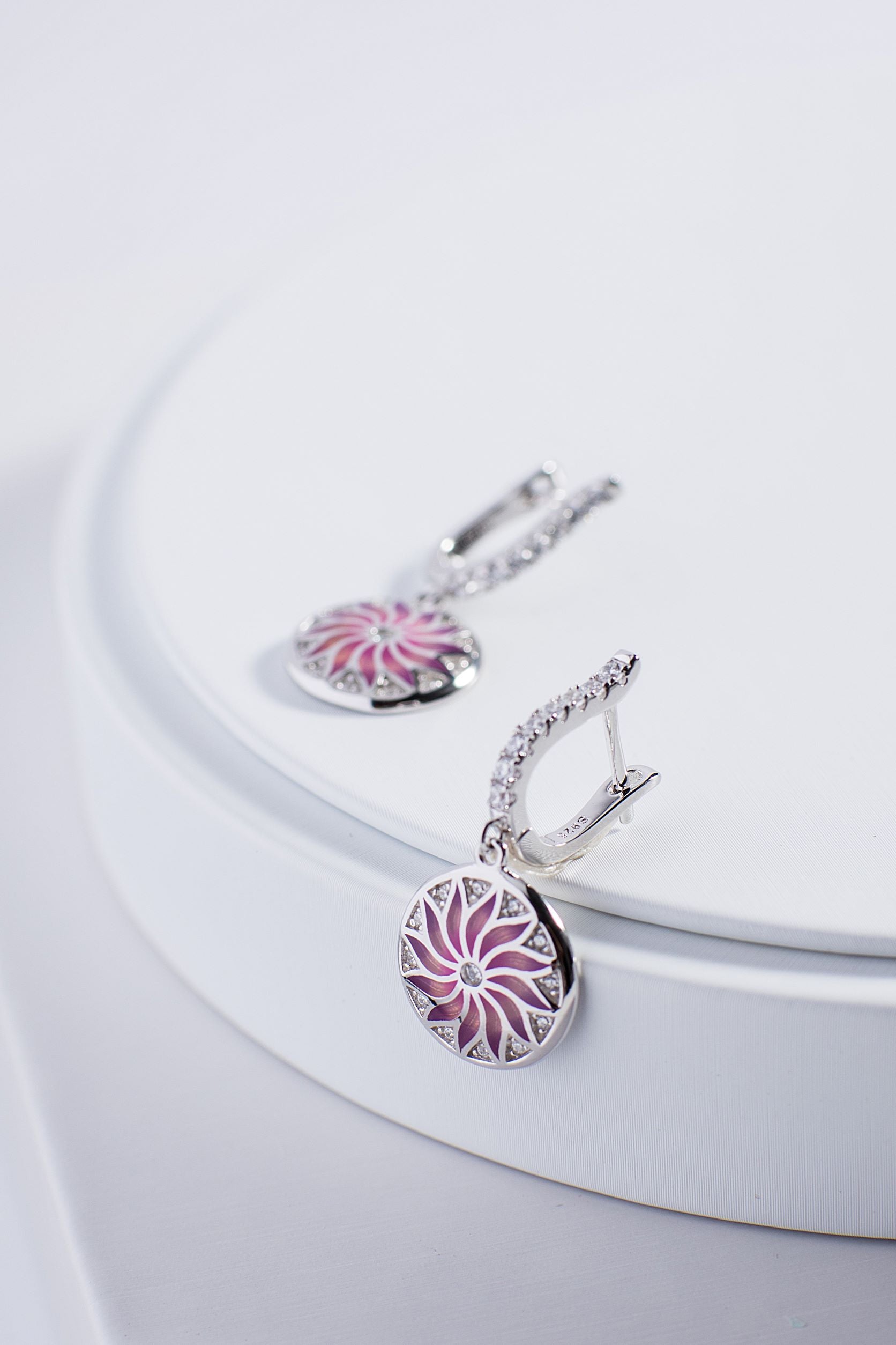 Add a touch of sophistication to your wardrobe with these elegant Circle Datura Stramonium Pink Enamel Silver Drop Earrings. The enamel pendant delicately hangs from the sterling silver hook, merging classic style elements with modern detailing. Perfect for any occasion, these earrings are a must-have addition to your jewelry collection.