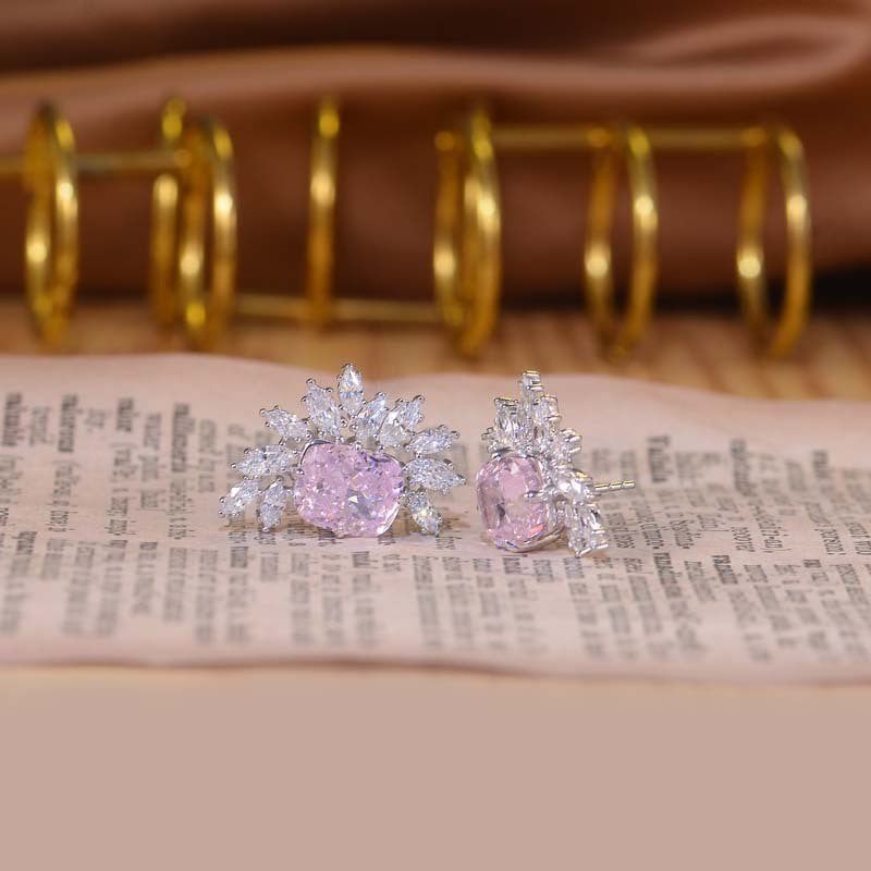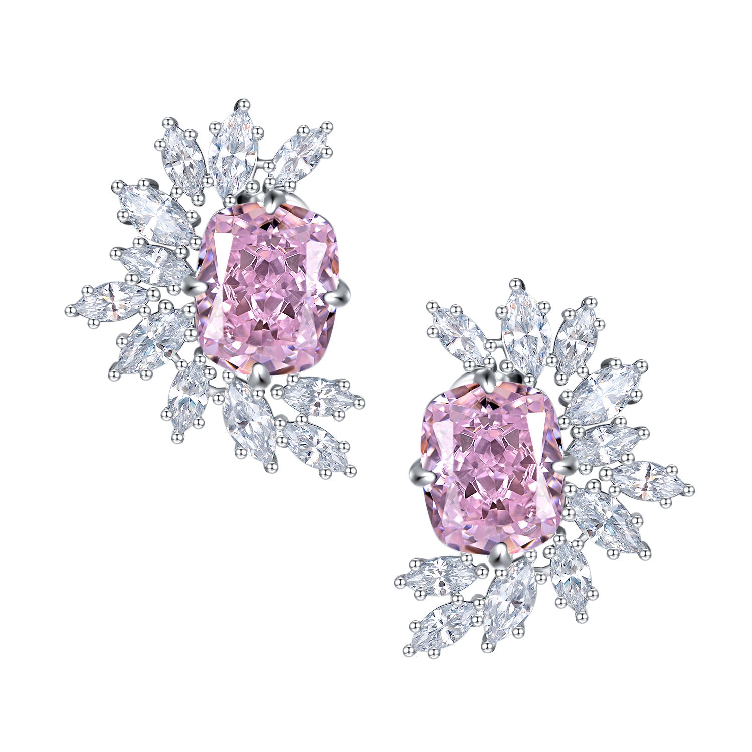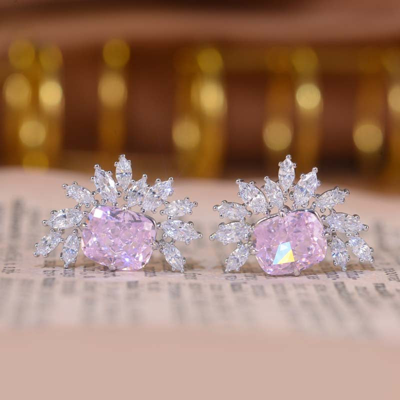 This studs earring features pink rectangular zircon as the main character, symbolizing stability and nobility. The design of the earrings is simple, with a half annular of horse eye shaped white zircon petals surrounding the zircon, resembling a half blooming flower, adding elegance and sweetness.