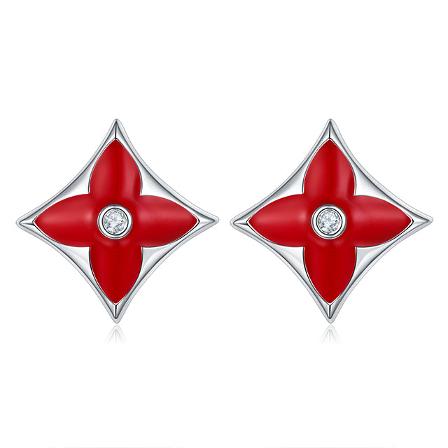 Red Clover Rhombus Enamel Silver Stud Earrings