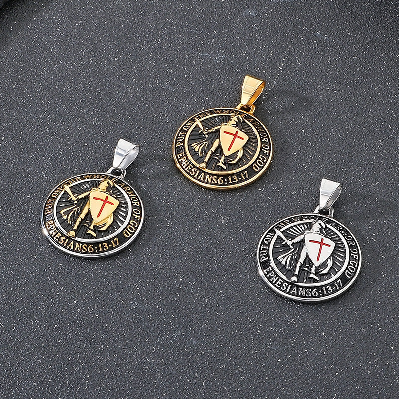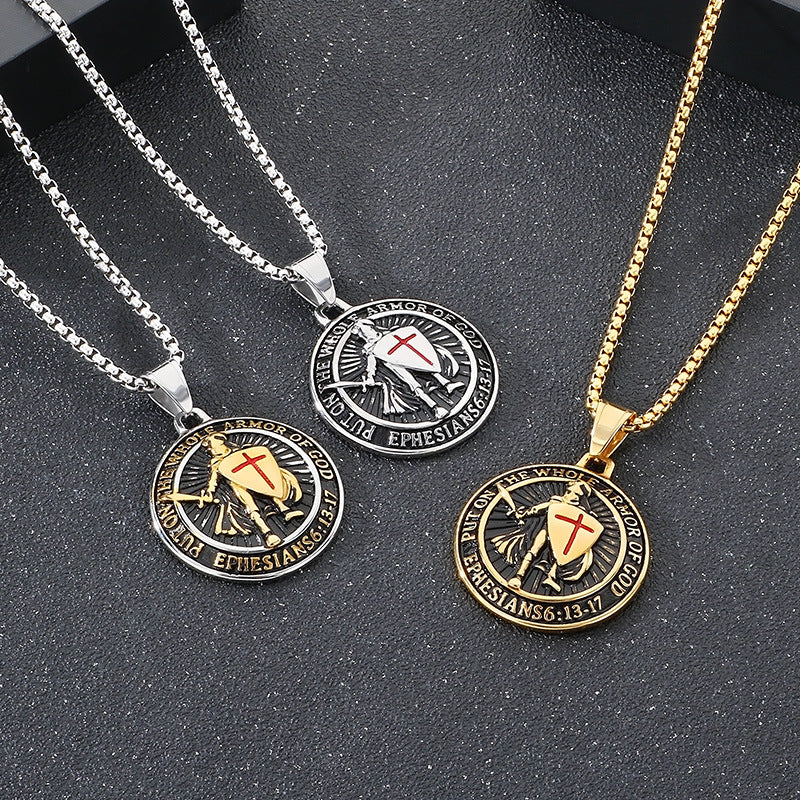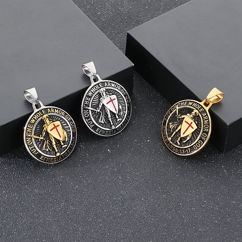 The pendant features a retro red cross shield emblem with a vivid epoxy finish set on a solid metal base. Its striking design captures the heraldic flair of Templar symbolism, updated for modern wear with a rugged, masculine silhouette.