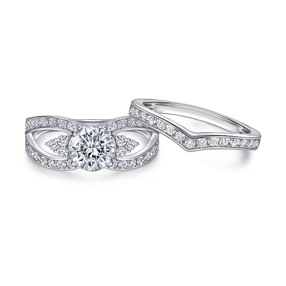Round Zircon Modern Split Shank with V-shape Silver Ring Set