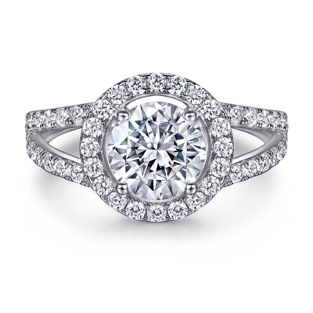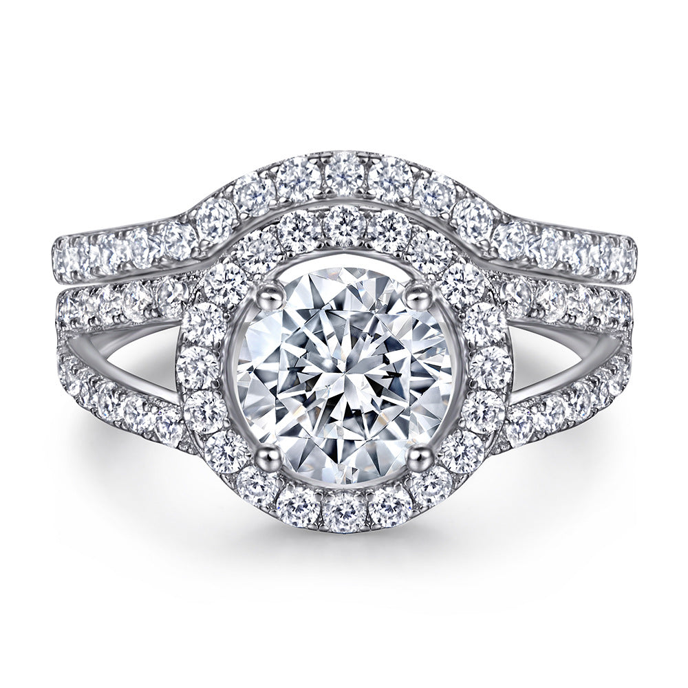 Round Zircon Soleste Halo Split Shank Silver Ring Set