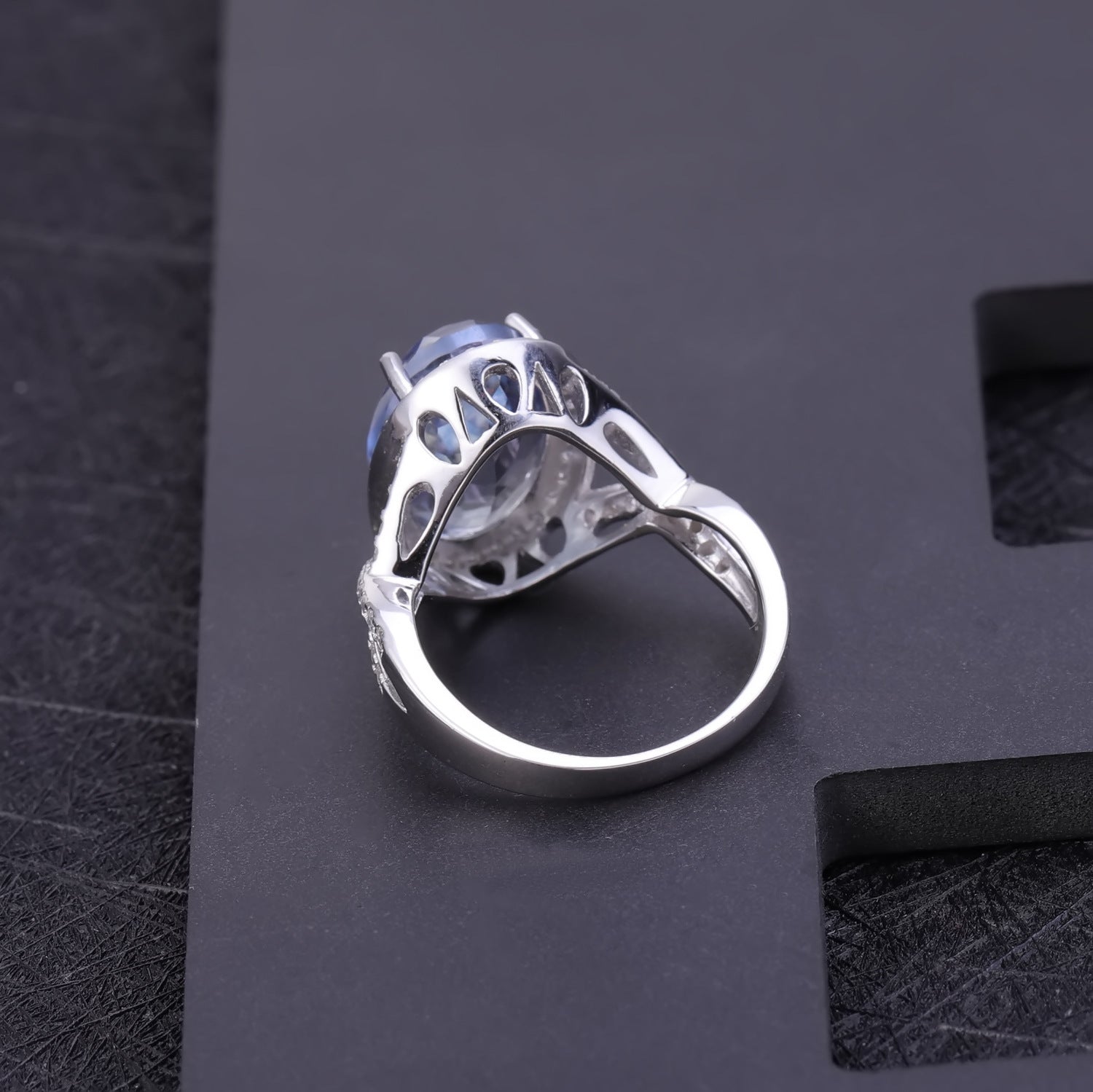 This Oval Soleste Halo Modern Split Shank Silver Ring is an exquisite piece of jewelry for women, featuring a stunning oval blue crystal at its center, surrounded by the classic Soleste Halo. The ring arm is decorated with small zircon stones, for a striking and modern look. The perfect accessory for a special occasion.