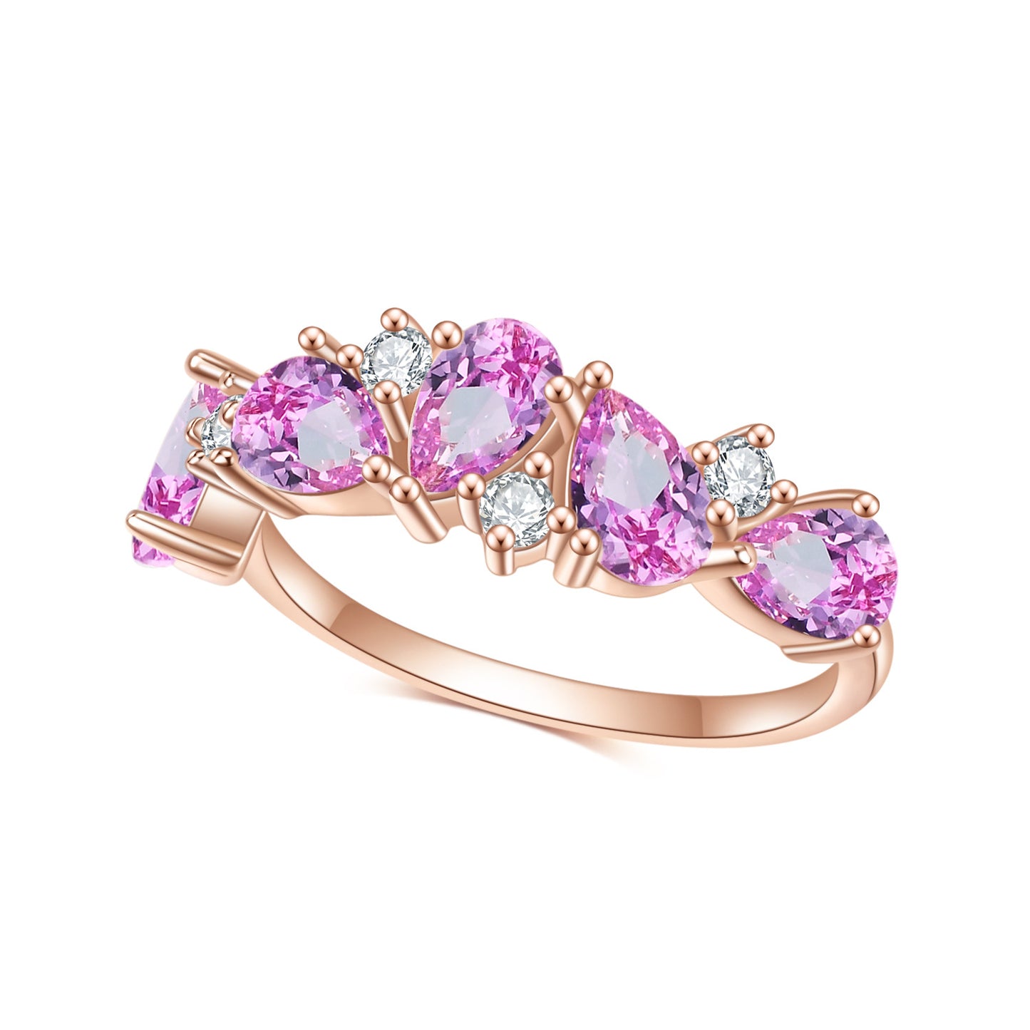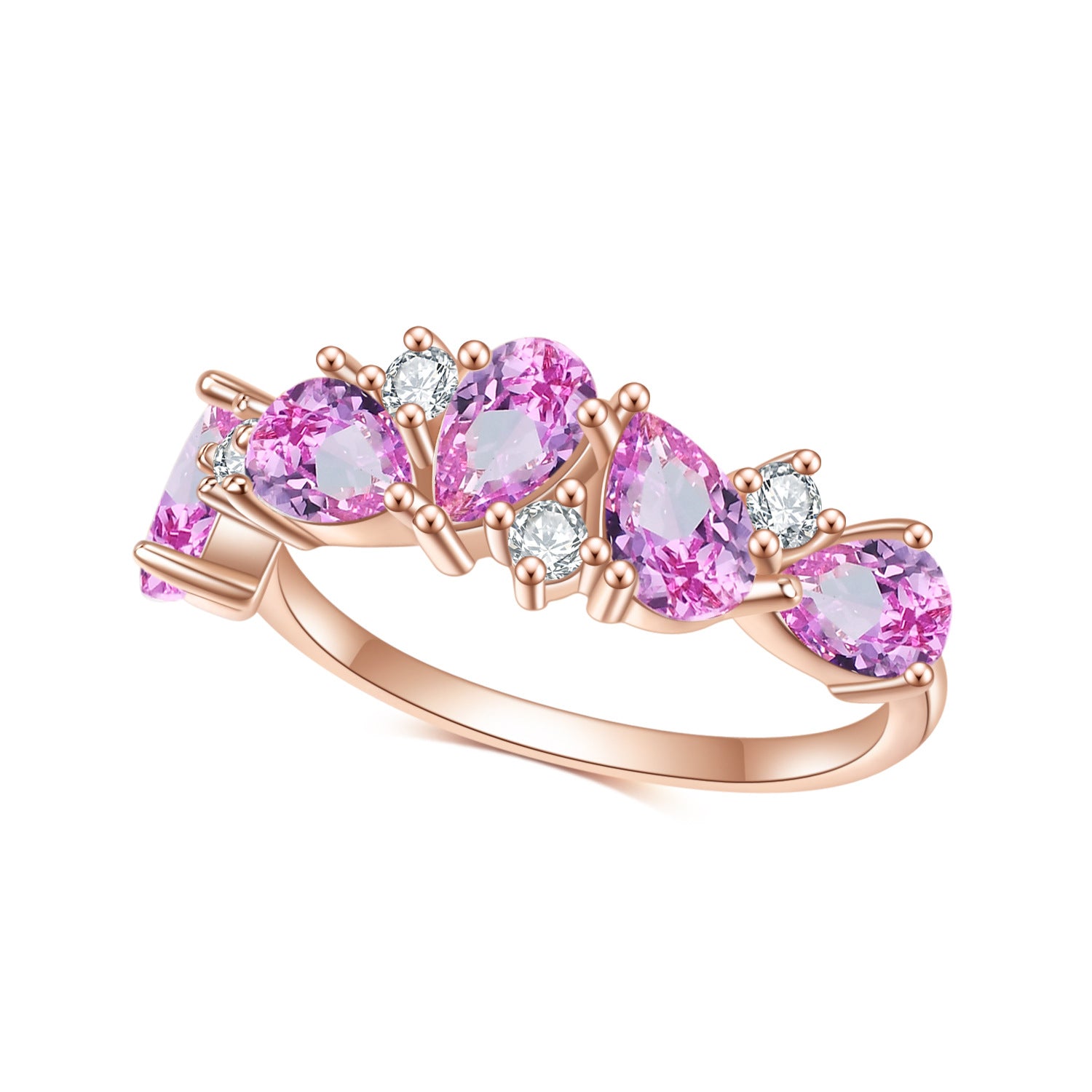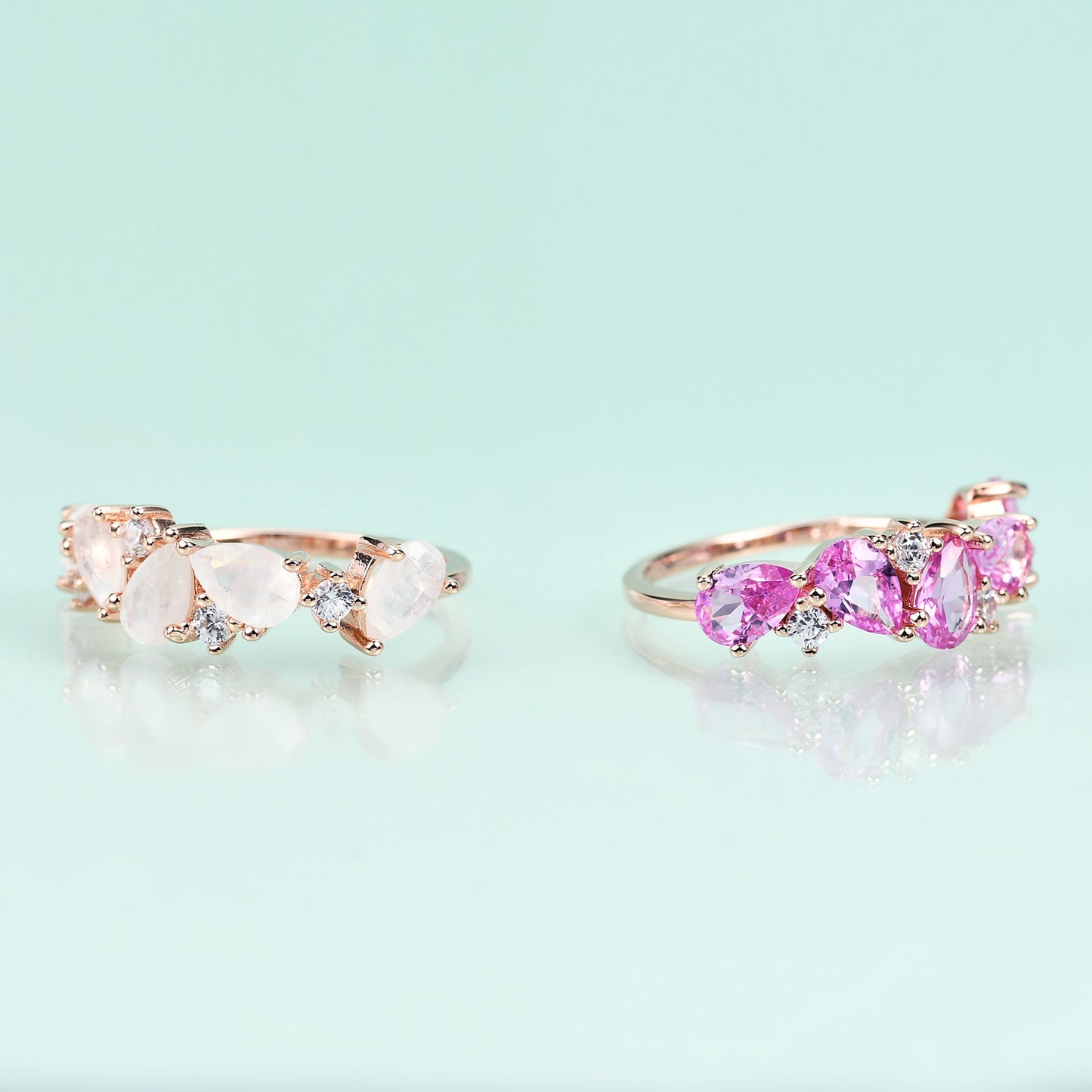 Row of Pear Shape Barbie Pink Corundum and Zircon Silver Ring