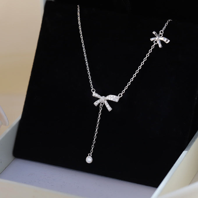Zircon Bowknot Tassle Silver Necklace for Women