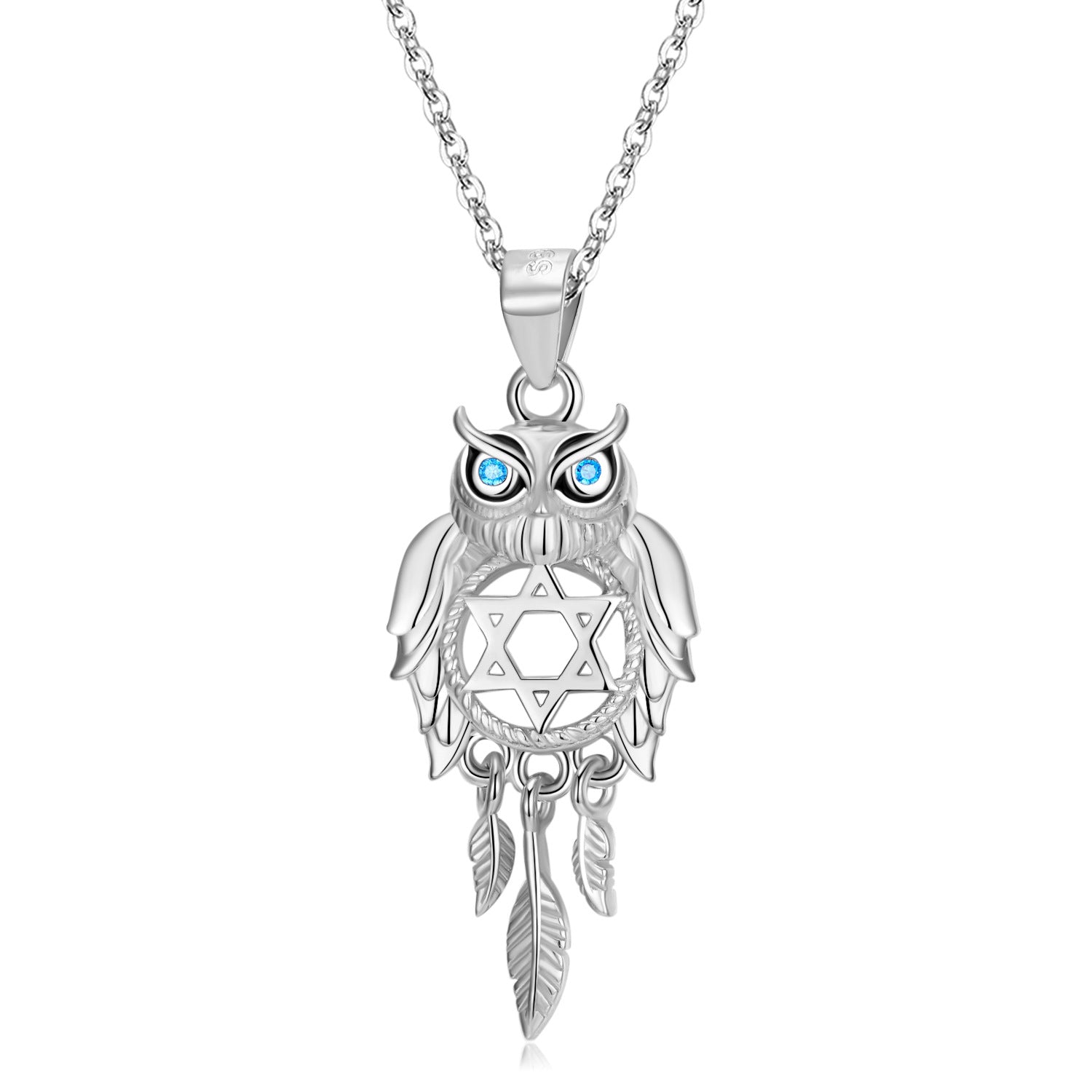 This Owl hollow Dream Catcher Silver Pendant is sure to catch your dreams. Two dazzling blue Zircon decorate the hollow owl eye for a magical effect. Give your dreams a chance to come true!