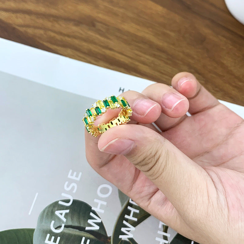 Illuminate your look and add a touch of luxury with this gorgeous Emerald Cut Green and Yellow Zircon Beaded Silver Ring for Women.This stunning piece is crafted from sterling silver plated in gold and beaded with dazzling Emerald Cut Green and Yellow Zircons. Let it elevate your look with luxurious style.