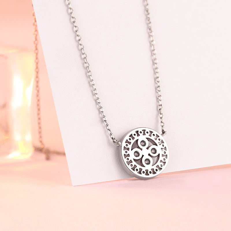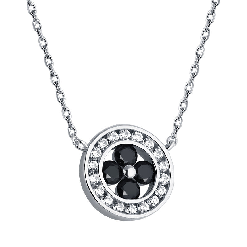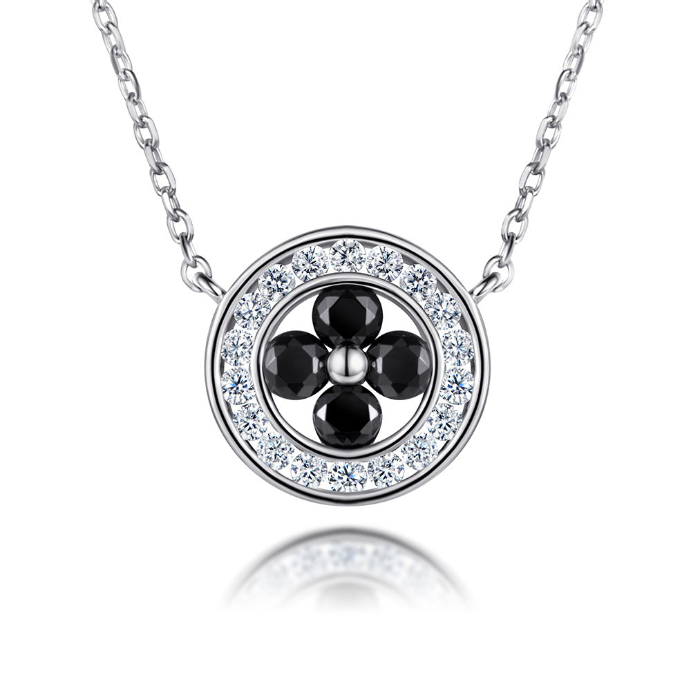 Black Zircon Four-leaf Clover Circle Pendant Silver Necklace for Women
