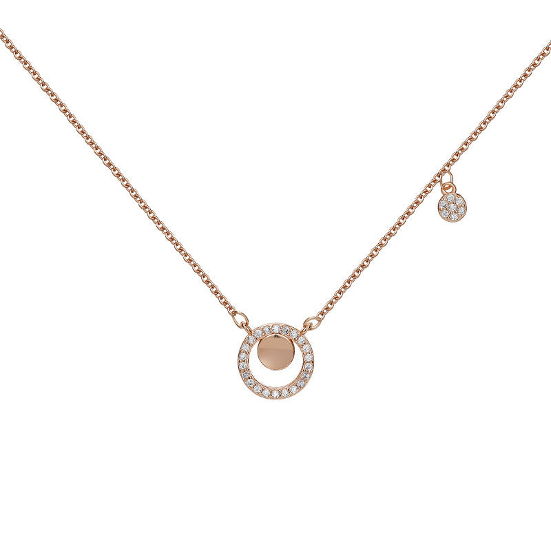 This sterling silver necklace is designed with a hollow Zircon Circle Pendant decorate with a Smooth Round piece, sure to make a fashionable statement. Crafted from quality materials, it's the perfect accessory that will bring a touch of elegance to any look.