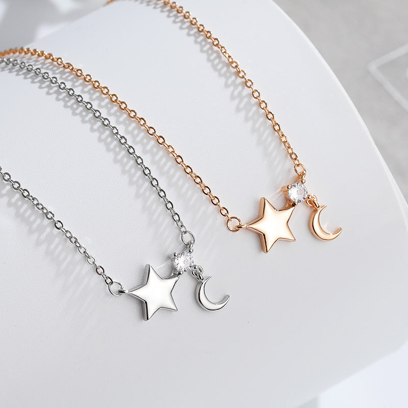 Smooth Star Moon with Zircon Silver Necklace for Women